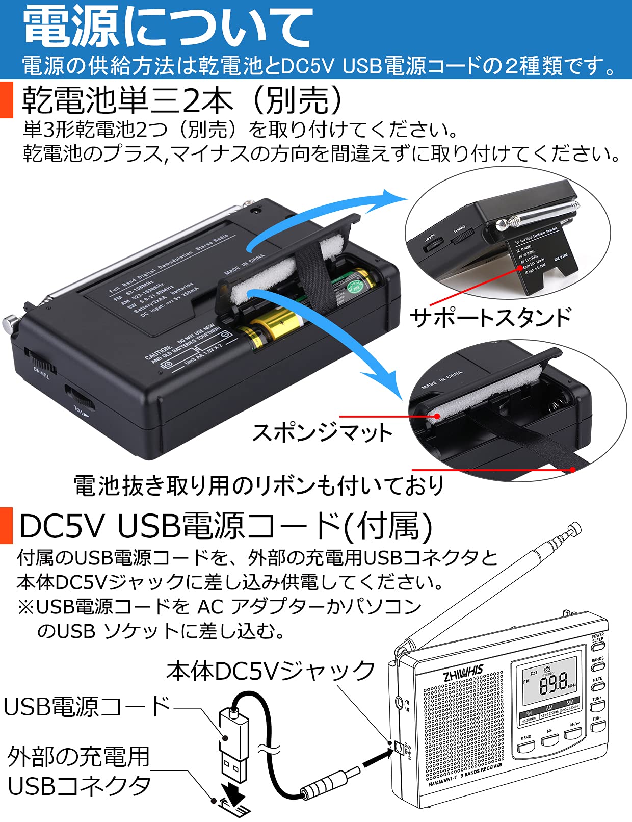 【在庫処分】ZHIWHIS ラジオ 小型ポータブル FM/AM/SW ワイドfm対応 クロック防災ラジオ 電池式 タイマー/目覚まし時計/デジタル時計/キーロック/プリセット機能付き 横置き型 携帯 学習 災害用 日本語取説&書付き
