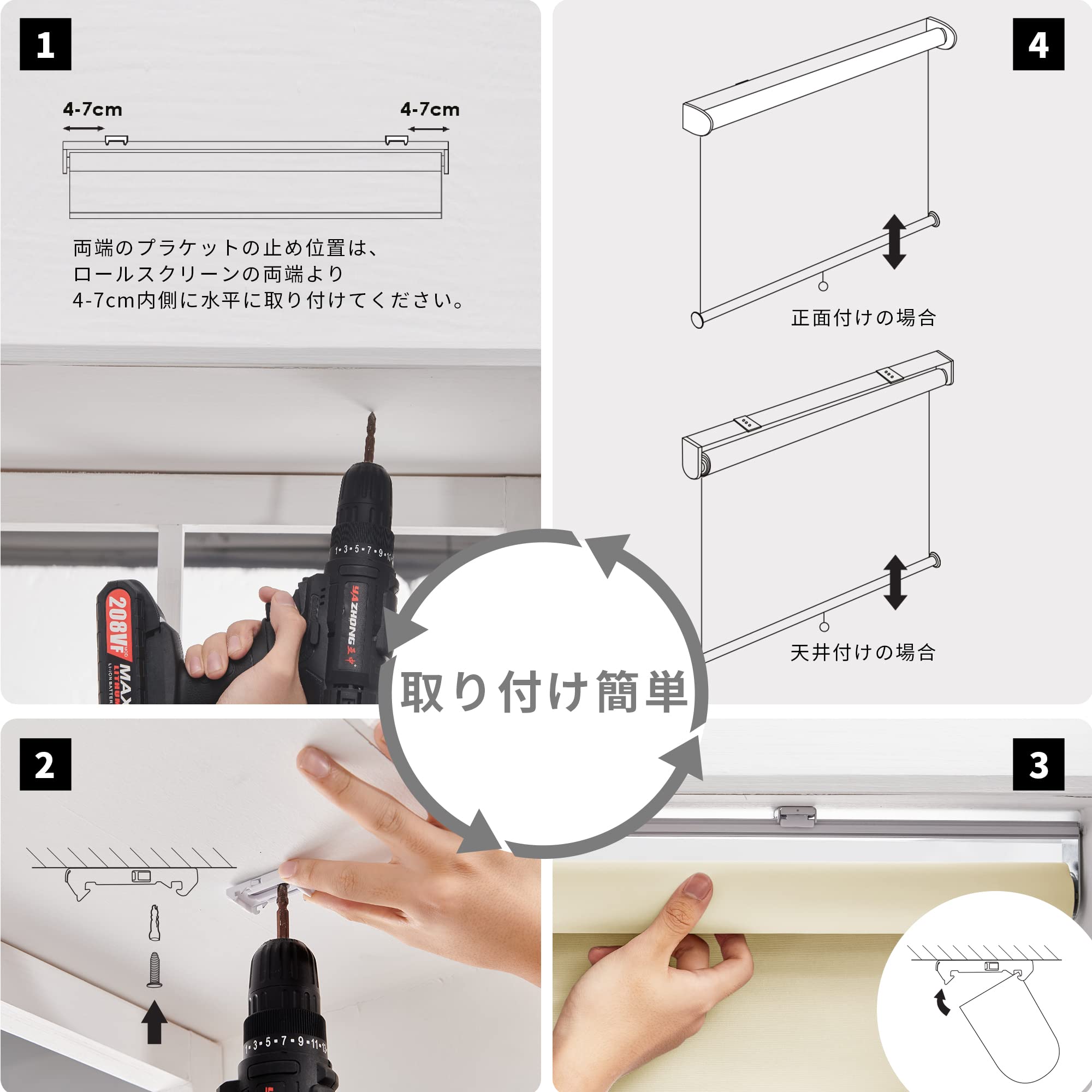 【取り付け方法】天井付けと正面付けタイプは窓枠にビス穴をあけネジで取り付けます。窓枠内に取り付ける「 天井付け」は圧迫感がなく、窓際にエアコンや家具を設置することもできます。窓枠外に取り付ける「正面付け 」はすき間から入る光や外からの視線をしっかり防ぎます。