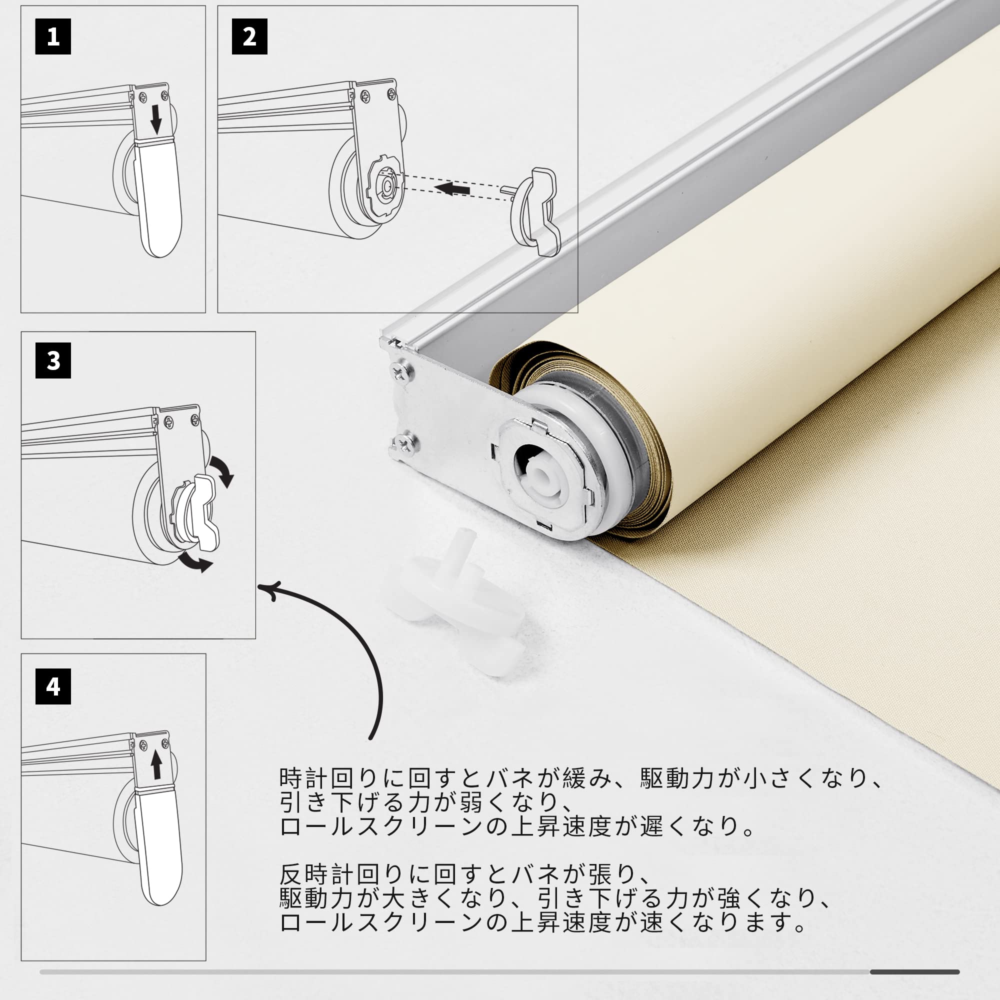 【巻き上げの速度の調節可能】垂直でチェーンに軽く引っ張ってから手を離すと、ロールスクリーンは自動的に上がります。下方向に引いて手を離すと止まります。ロールカーテンの生地の巻き上げスピードをダイヤルで簡単に調節できます。時計回りに回すとバネが緩み、駆動力が小さくなり、引き下げる力が弱くなり、ロールスクリーンの上昇速度が遲くなり。反時計回りに回すとバネが張り、駆動力が大きくなり、引き下げる力が強くなり、ロールスクリーンの上昇速度が速くなります。