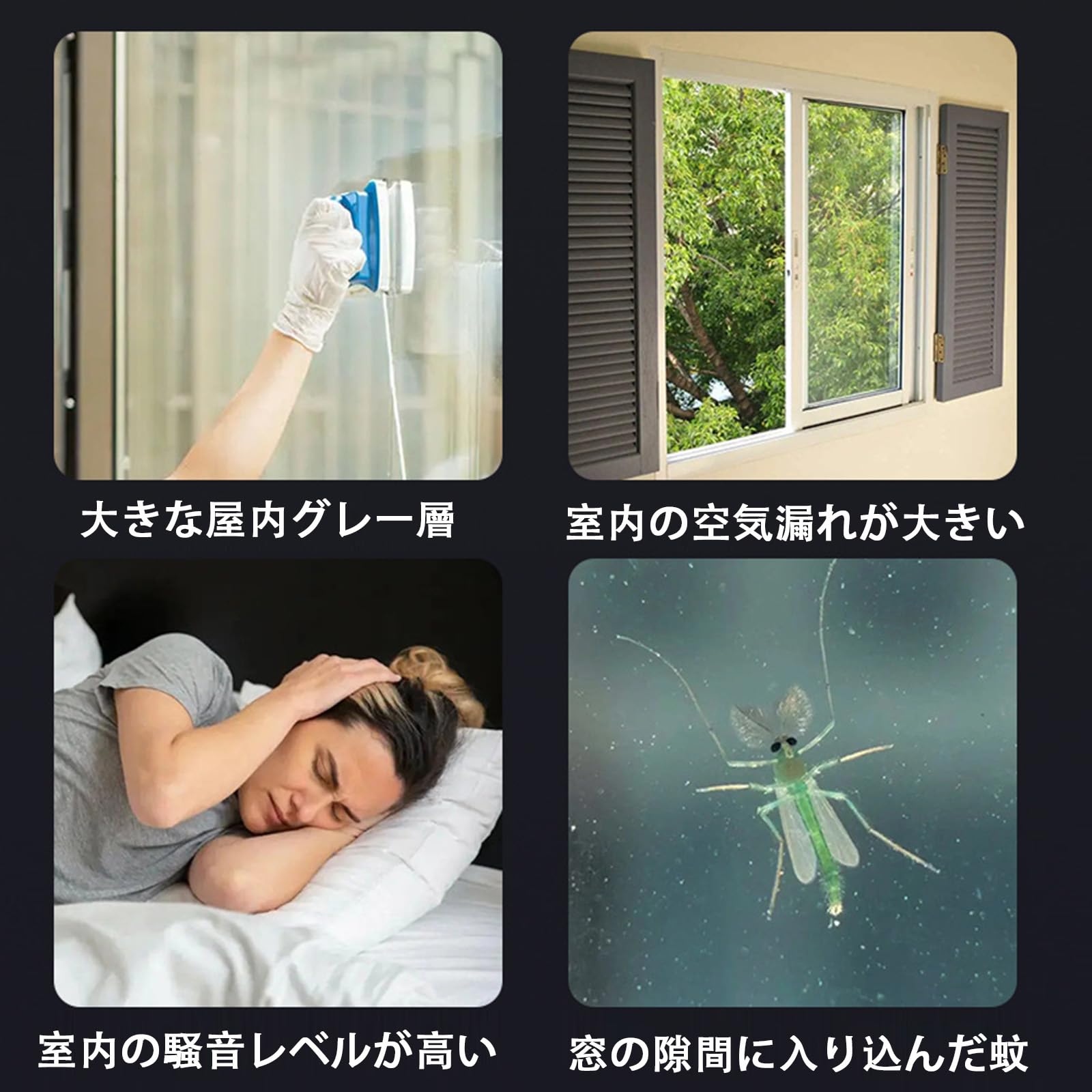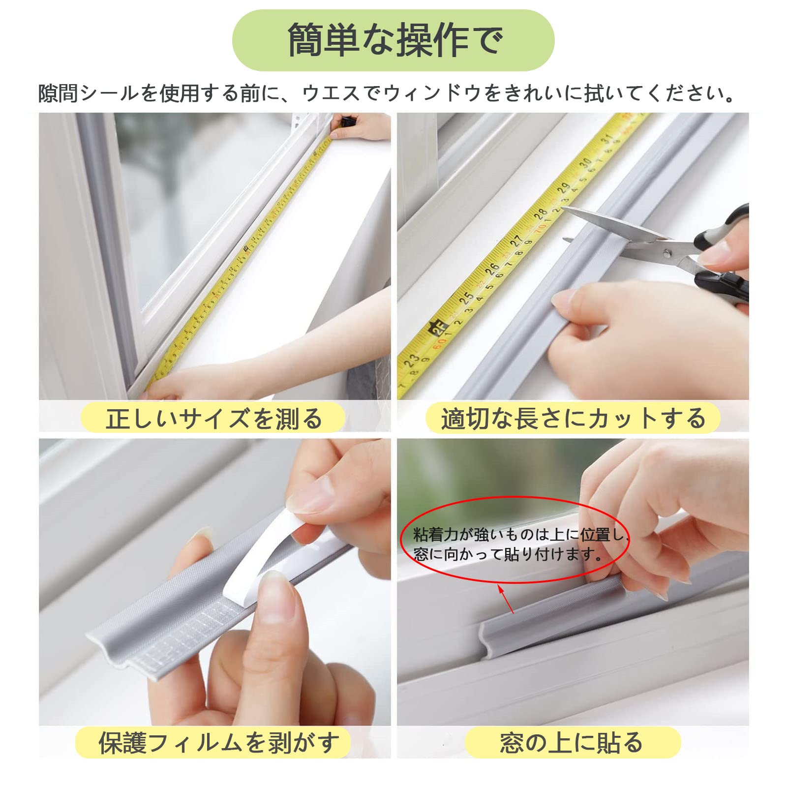 ☆【取り付け簡単】隙間テープを使う前に、ドアや窓の表面をきれいに拭いて、完全に乾燥してください。隙間テープは自粘着タイプなので、保護シールをはがせて、を、必要なところに貼り付ける。お年寄りや女性の方にも使いやすいシンプルなデザインです。防音、防虫、防塵、防水、花粉対策、気密性向上が特徴です。隙間に使えると、一定程度に室外の騒音を吸収でき、静かな環境をキープします。