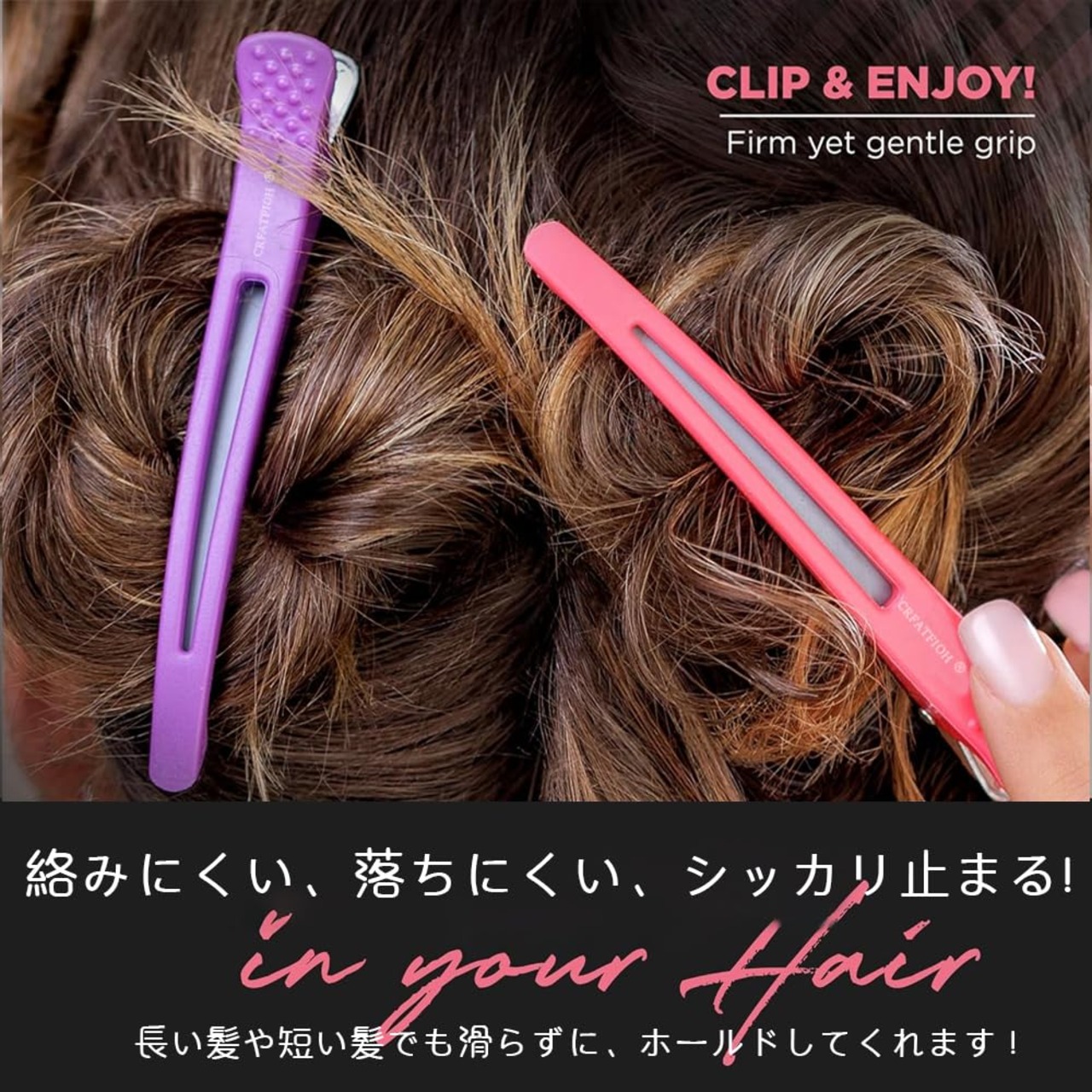 【ダッカールクリップの優れもの】滑り止めのシリコンラバーがあるので、髪にあとがつかない。髪が多めの方や、サラサラ髪の方にも、しっかりと髪をはさんで、ずり落ちてこないので安心だ。髪にシッカリとまるように、L字型バネに改良しバネ部分を強化しました。髪の毛がひっかかりにくいです。ブロッキングしたり前髪を留めたりと、カットやヘアアレンジの際などに使われています。