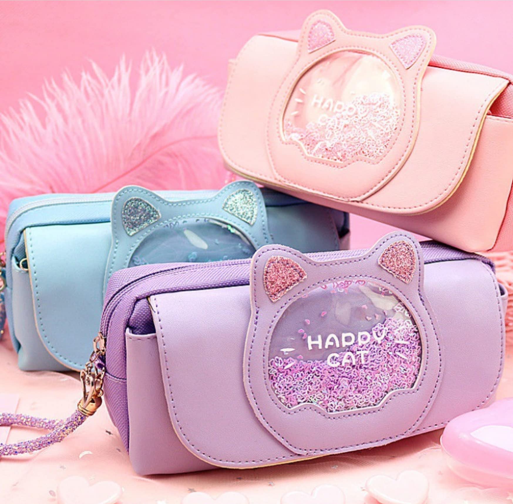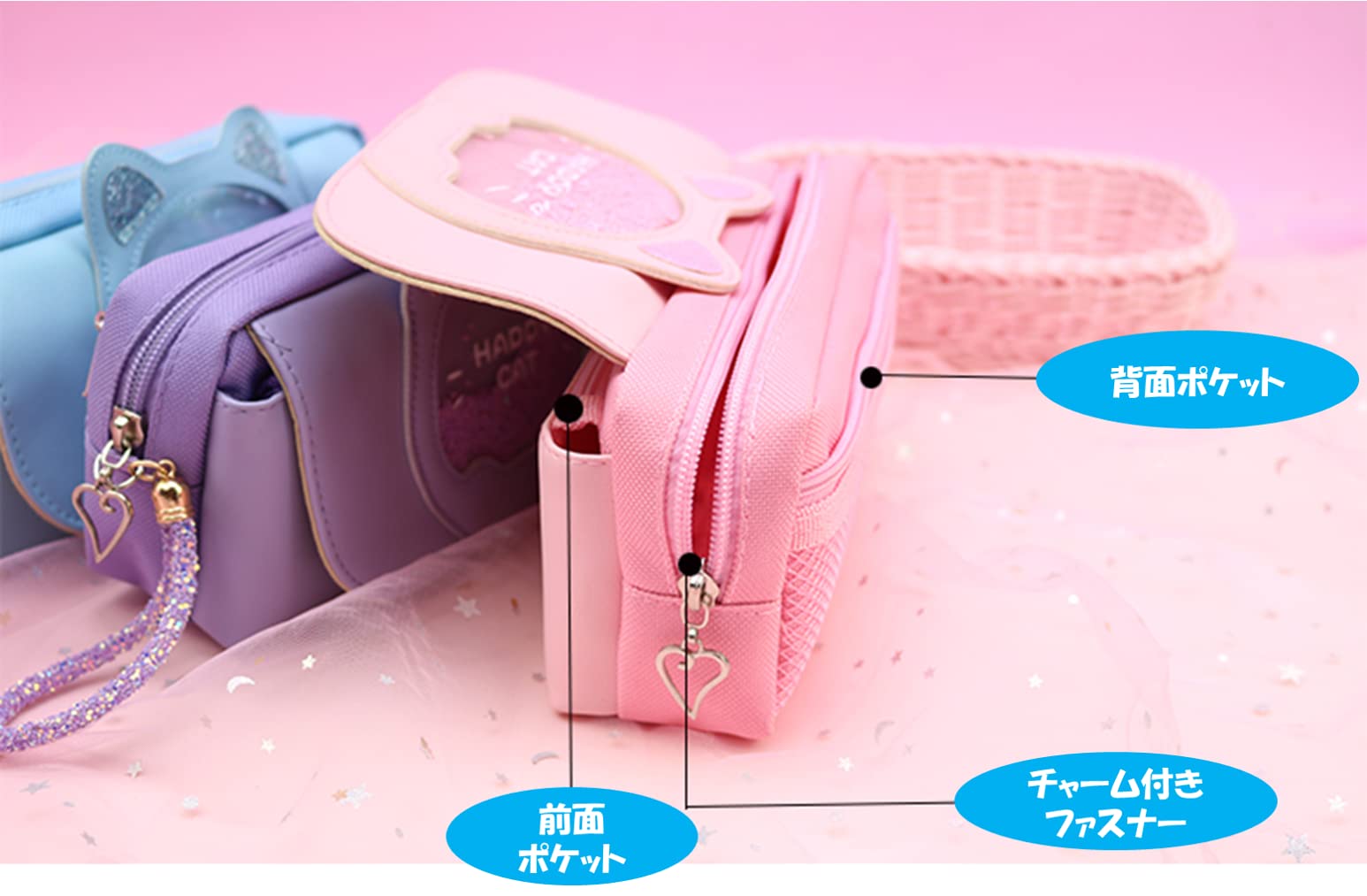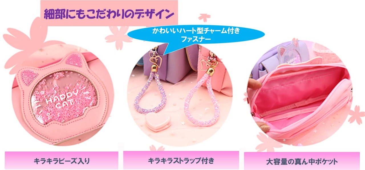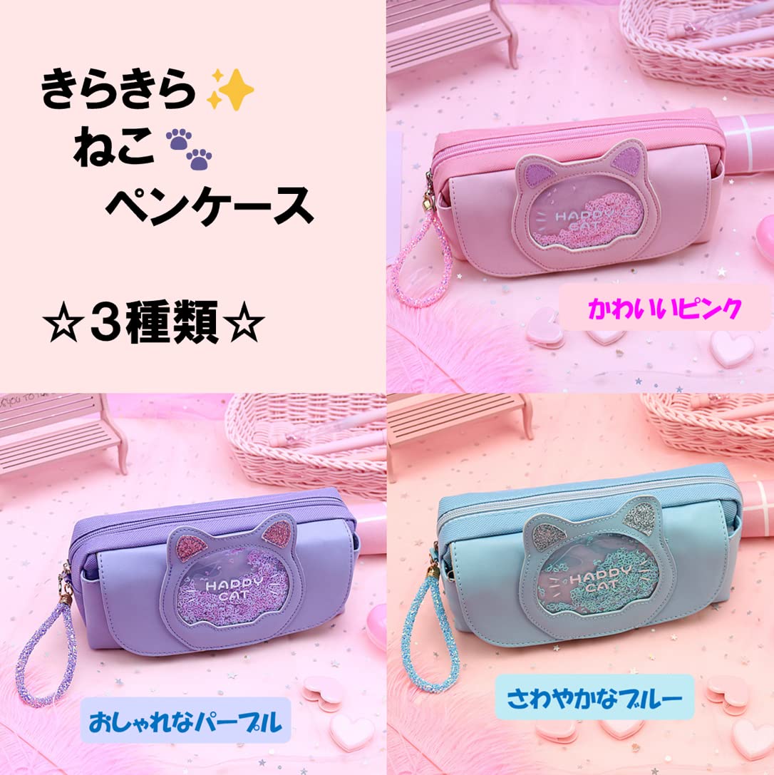 【可愛いねこみみのデザイン】キラキラビーズが可愛い♪ねこのペンケースです★前面が猫をモチーフとしたデザインで、ネコミミに加え、キラキラのビーズがオシャレなペンケースとなっています。細部までこだわっており、チャーム部分もハート型で可愛く仕上がっています。かわいいながらもシンプルなデザインのため、子どもから大人まで使用していただけます。カラーは、落ち着きのある可愛い色調のピンク、パープル、ブルーがあります。 【大容量で便利な3ポケット】 約21×9×7.5cmのサイズで、広々としたスペースには、たくさんのペンや鉛筆、定規などの文房具を収納できます。 チャームつきのファスナーで、開け閉めもラクラク☆真ん中のポケット以外に、前ポケットと、後ろにメッシュポケットがあり、たくさんの文房具が入ります☆ 開けたら口が大きく開くので、ペンの出し入れもラクラク☆底が広くて、机の上にも置きやすい☆ 【多機能】ペンケースだけでなく、化粧ポーチ、化粧品収納、小物収納ポーチ、小物入れとしてもお使いいただけます。コンパクトなので様々な用途にご使用ください。 【高品質】頑丈なPUレザーを採用し、握りやすく、軽量で耐久性のある仕様になっています。傷つきにくく、摩耗しにくいため、長期間使用していただけます。 【喜ばれるギフト】小学生の女の子を中心に、可愛いデザインで良い評判をいただいています。ネコ耳とキラキラビーズに加えて、可愛いチャーム部分がシンプルでありながら人気の商品です。ピンク、パープル、ブルーと3つのカラーバリエーションを用意していますので、ご希望の色をお選びください。