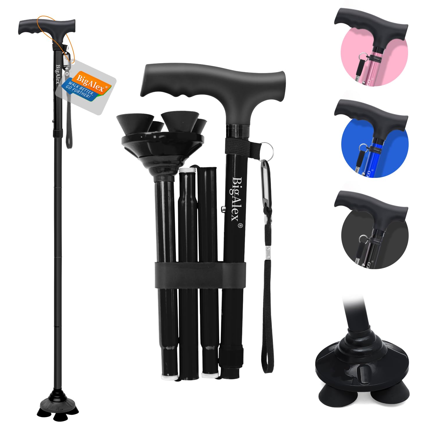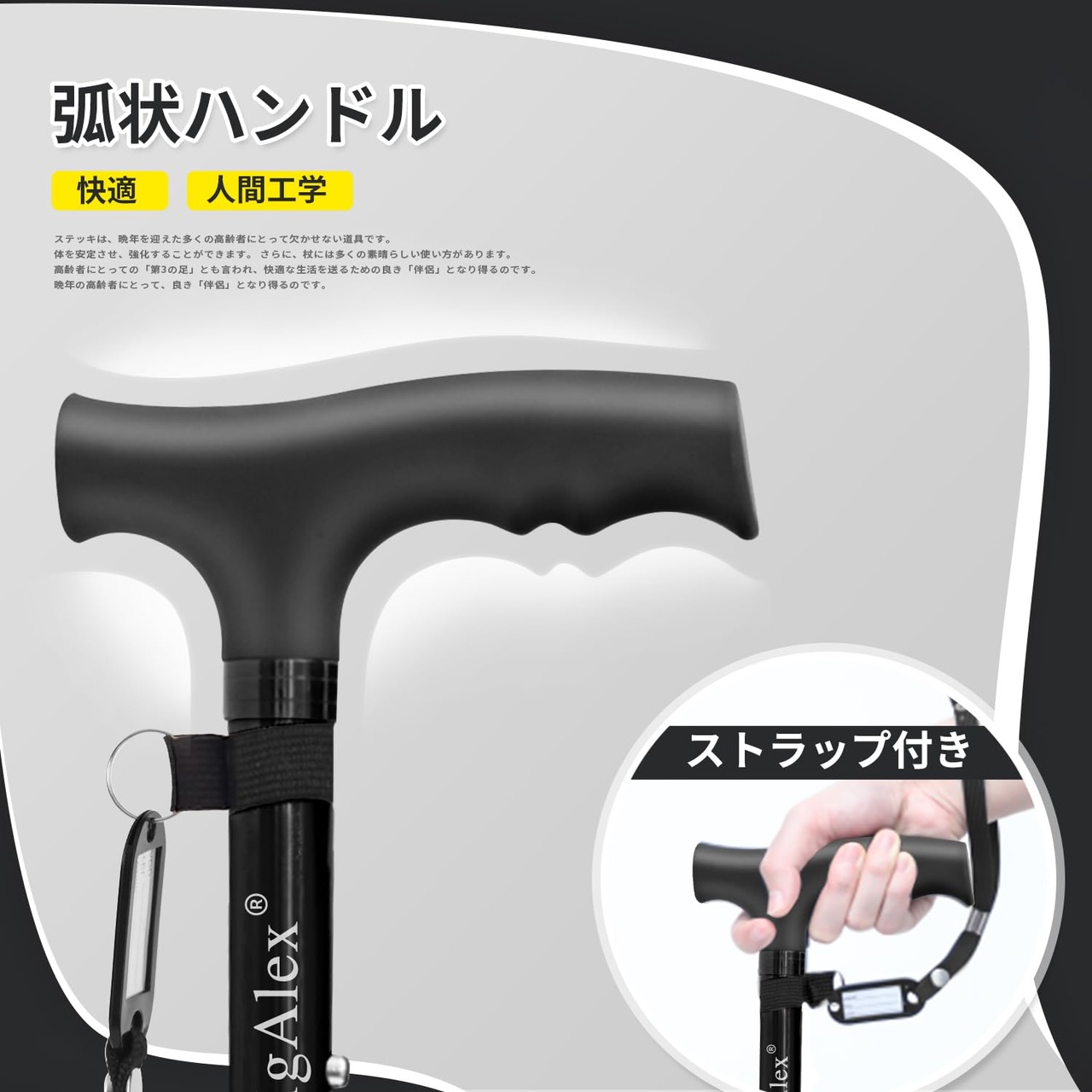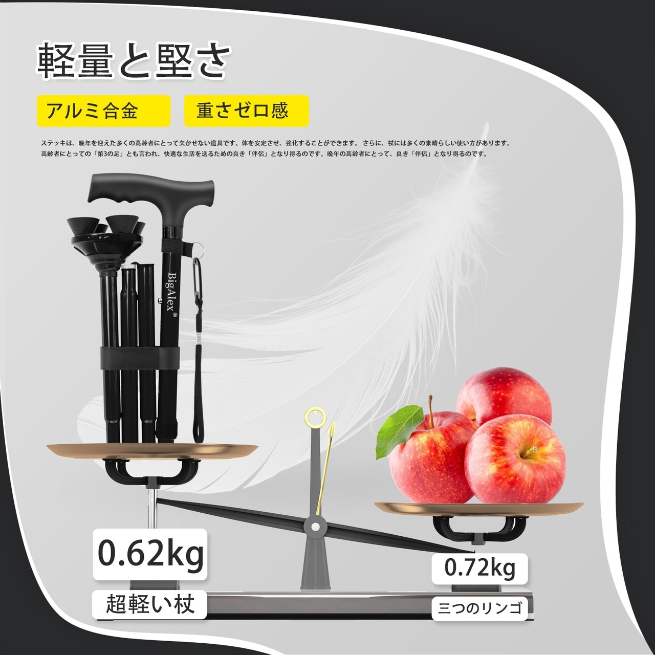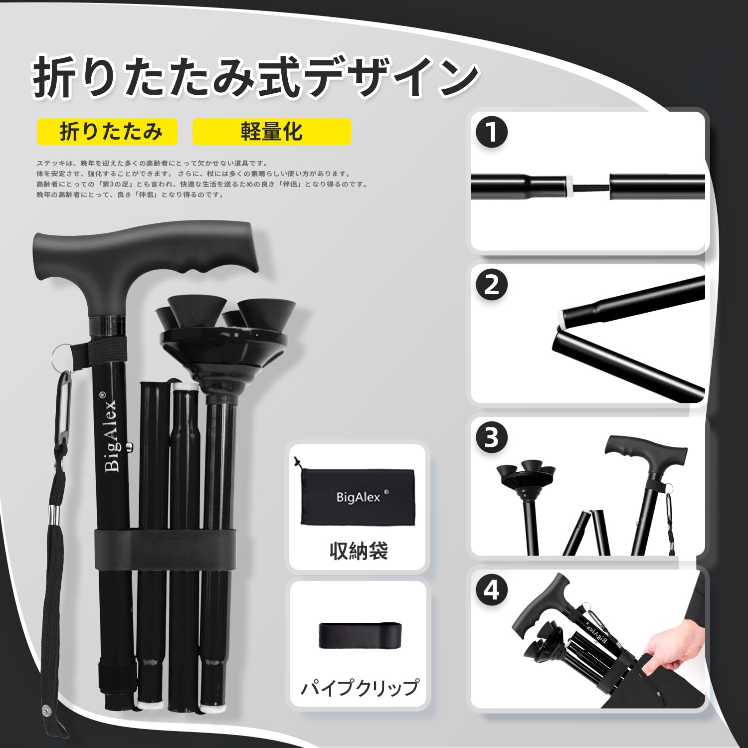 ビグアレクス(BigAlex)折りたたみ杖 ステッキ 自立杖 ブラック男性女性 5段階調節 おしゃれ 倒れない 高齢者 介護 軽量 アルミ 長さ調整可能 歩行支援 夜間散歩 母の日 父の日 敬老の日 プレゼント (86-96センチ ブラック)