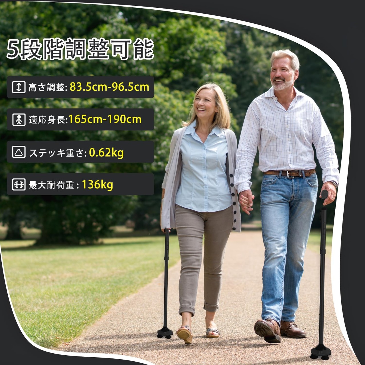 【五段式高さ調節】86センチから96センチまでの高さを調整することができ、歩行での使用はもちろん、立ち上がり時のサポートなど幅広く対応でき、ご自身で簡単に長さ調節をしていただけます。これは、168cm-188cmのほとんどの人に適しています。