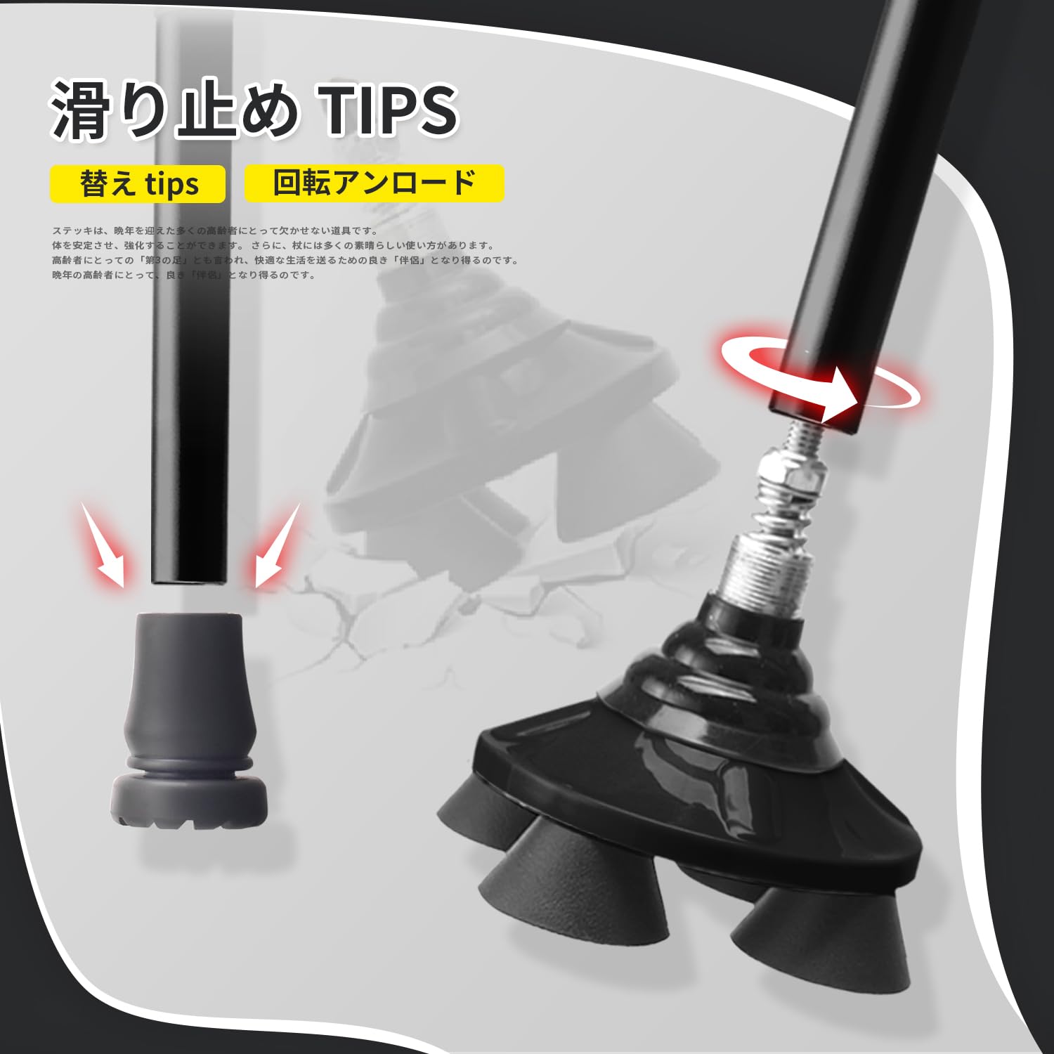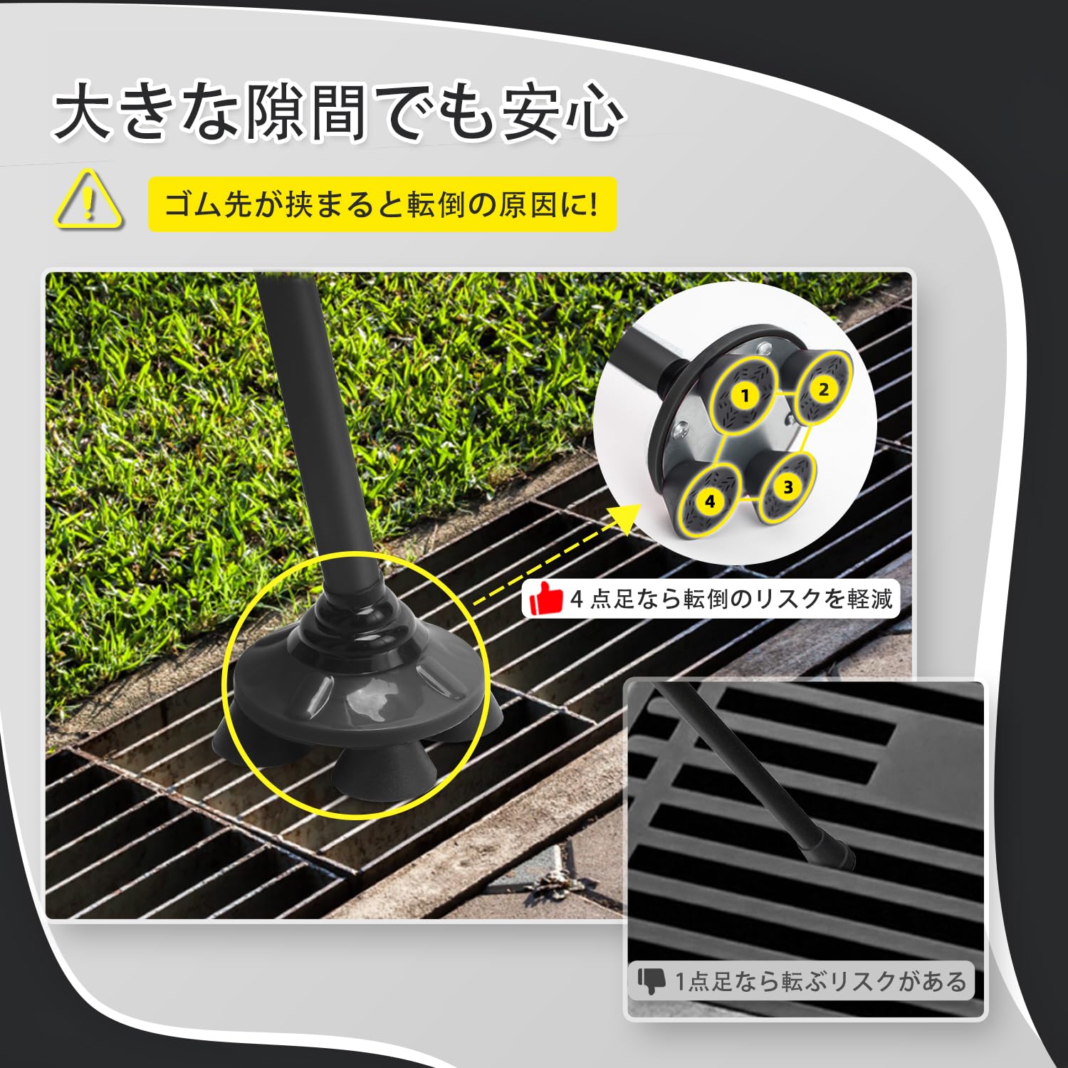 【360°自由回転】BigAlex杖のベースが360度自由に回転できます。ボールヘッド軸とプラスチックベースを使用して、その使用寿命を増やすことができ、部屋や他の場所で使用することができます。凸凹道や階段、坂道などの不安定な場所でも地面を捉え、より快適で安全な歩行が実現できます。