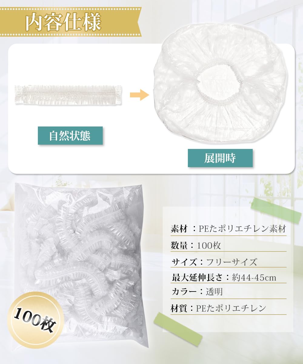 1●サイズ:フリー(男女兼用) 最大延伸長さ:約44~45cm;パッケージ:大容量の100枚入り.;材質:PEたポリエチレン;カラー:クリア。