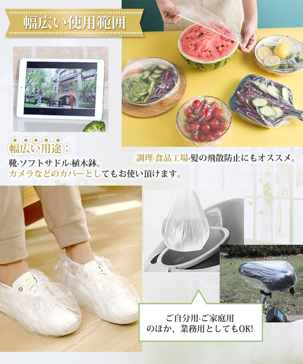 5●ヘアカラー・洗顔・シャワー・エステのときに利用するのはもちろん、靴・ソフトサドル・植木鉢・カメラなどのカバーとしてもお使い頂けます。調理・食品工場・髪の飛散防止にもオススメ。ご自分用・ご家庭用のほか、業務用としてもOK!