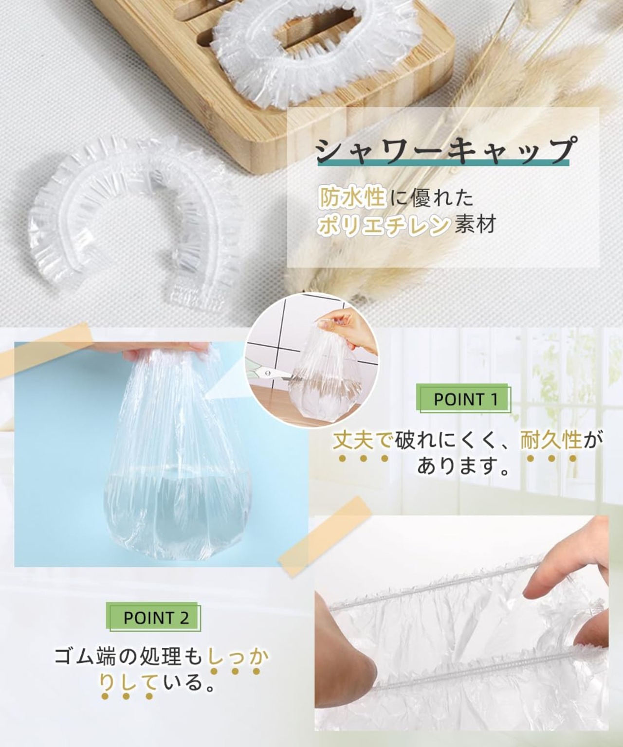 3●防水性に優れたポリエチレン素材を採用しており、丈夫で破れにくく、耐久性があります。ゴム端の処理もしっかりしているので、しっかり頭を包み。長く使用できます。
