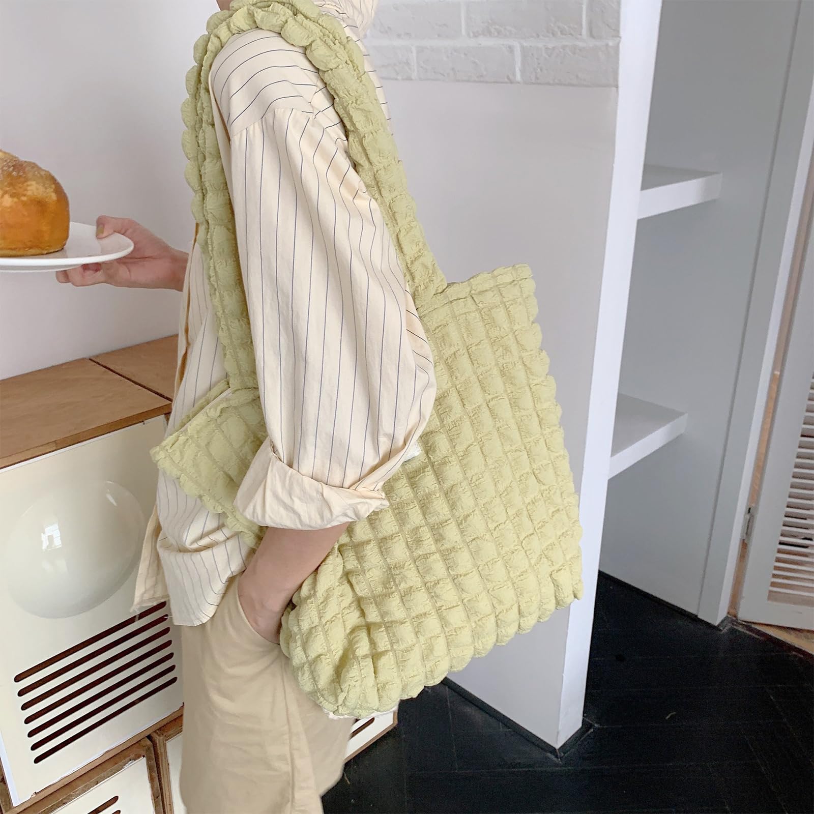 [happykau] ポップコーンバッグ トート キルティングバッグ レディース ショルダーバッグ シャーリング 可愛い 軽量 手提げ ファスナー付き おしゃれ 凸凹 通勤 通学 大容量