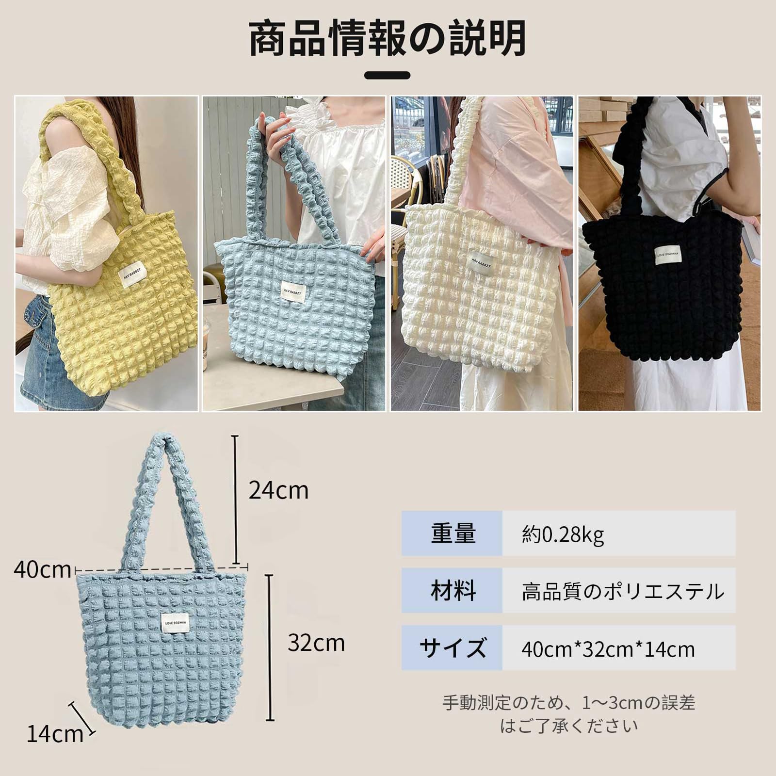 ?【高品質素材】当社のふわふわポップコーンバッグは高品質のポリエステル繊維で作られており、軽量で耐久性があり、柔らかくふわふわした手触りで、長期間耐久性があり、素晴らしい体験を提供します。 ?【多機能・実用性】ファッション性だけでなく、実用性にも優れたショルダーバッグです。 生活に必要なアイテムを収納できる大容量で、内側にポケットが2つ付いているので小物も分けて整理しやすいです。 軽量で耐久性に優れたデザインなので、仕事、ショッピング、日常生活など、いつでも必要なものを持ち運ぶことができます。 ?【ユニークなプリーツ生地】ふわふわのポップコーンバッグはユニークなプリーツ生地でデザインされており、自然に柔らかい手触りと雲の泡のように軽いです。 このデザインは、スタイル感を加えながら快適な体験をもたらします。 ?【多用途なファッション】このショルダーバッグは無地のデザインを採用し、さまざまな色をご用意しており、独特のプリーツにより、どんな服、ドレス、オフィスコーデ、イベント、パーティー、ショッピングなどに合わせても、ファッショナブルで多用途に使えます。あなたにファッション感をプラスします。 このバッグは、見た目を引き立てるために、さまざまなキュートでファッショナブルなペンダントと合わせるのにも適しています。 ?【商品サイズ】ショルダーバッグ高さ32cm*40cm*14cm、重量:258g、ハンドル:24cm。 おしゃれで可愛いだけではなく、ノートパソコン、タブレット、化粧ポーチ、着替え、折り畳み傘など様々なアイテムを楽々収納できる大容量のショルダーバッグです。