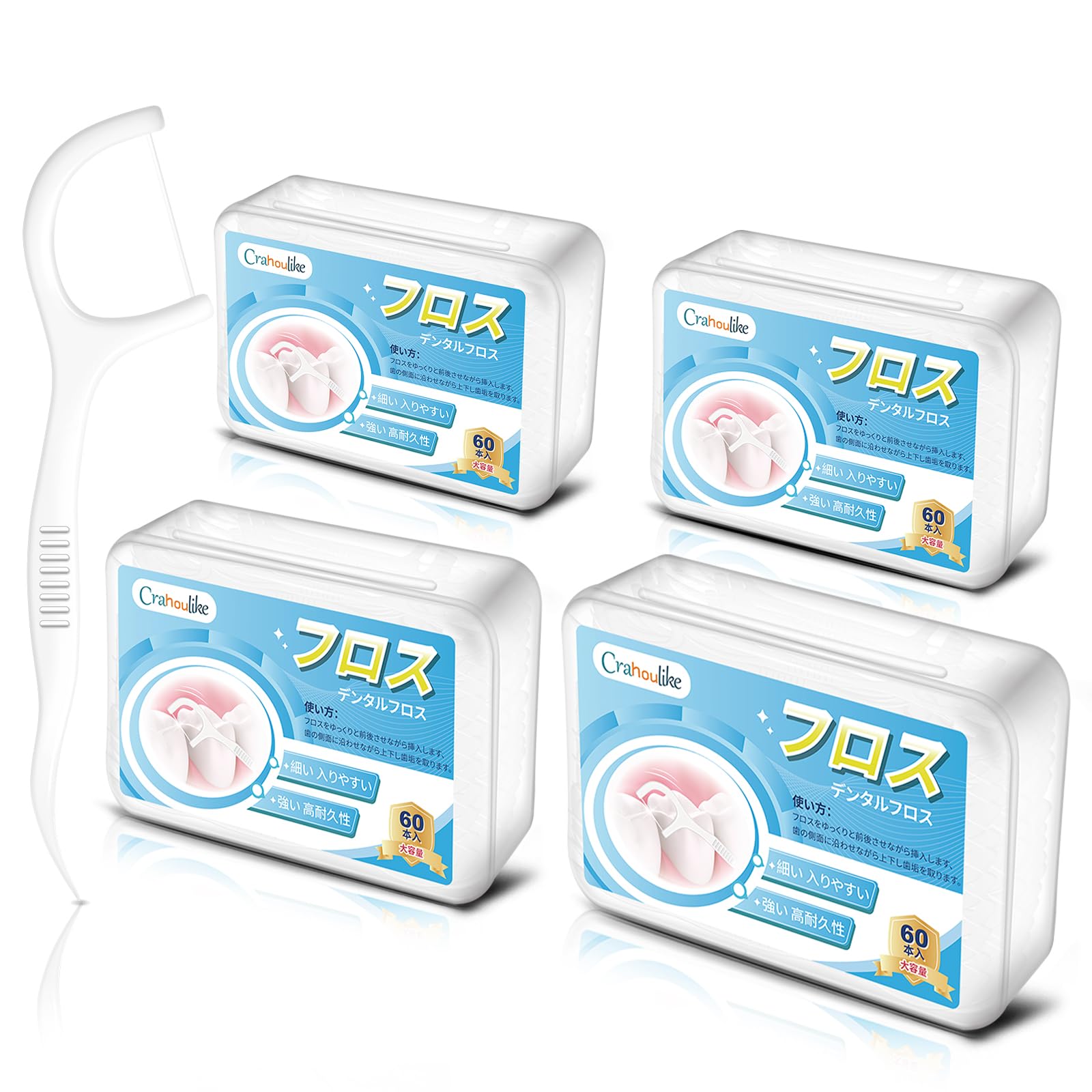 パッケージ内容:60本入/箱:4箱合計240本入。大容量のフロスは細い強いめでどんな人でも使いやすい。狭い歯間用、初めてデンタルフロスを使ったの初心者、使いやすかったです。