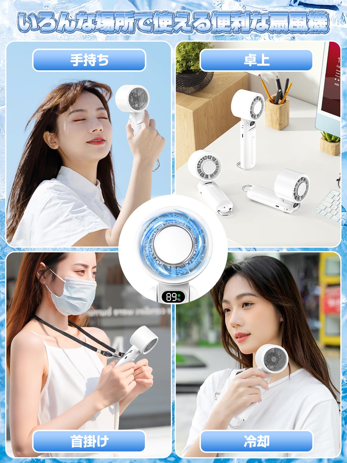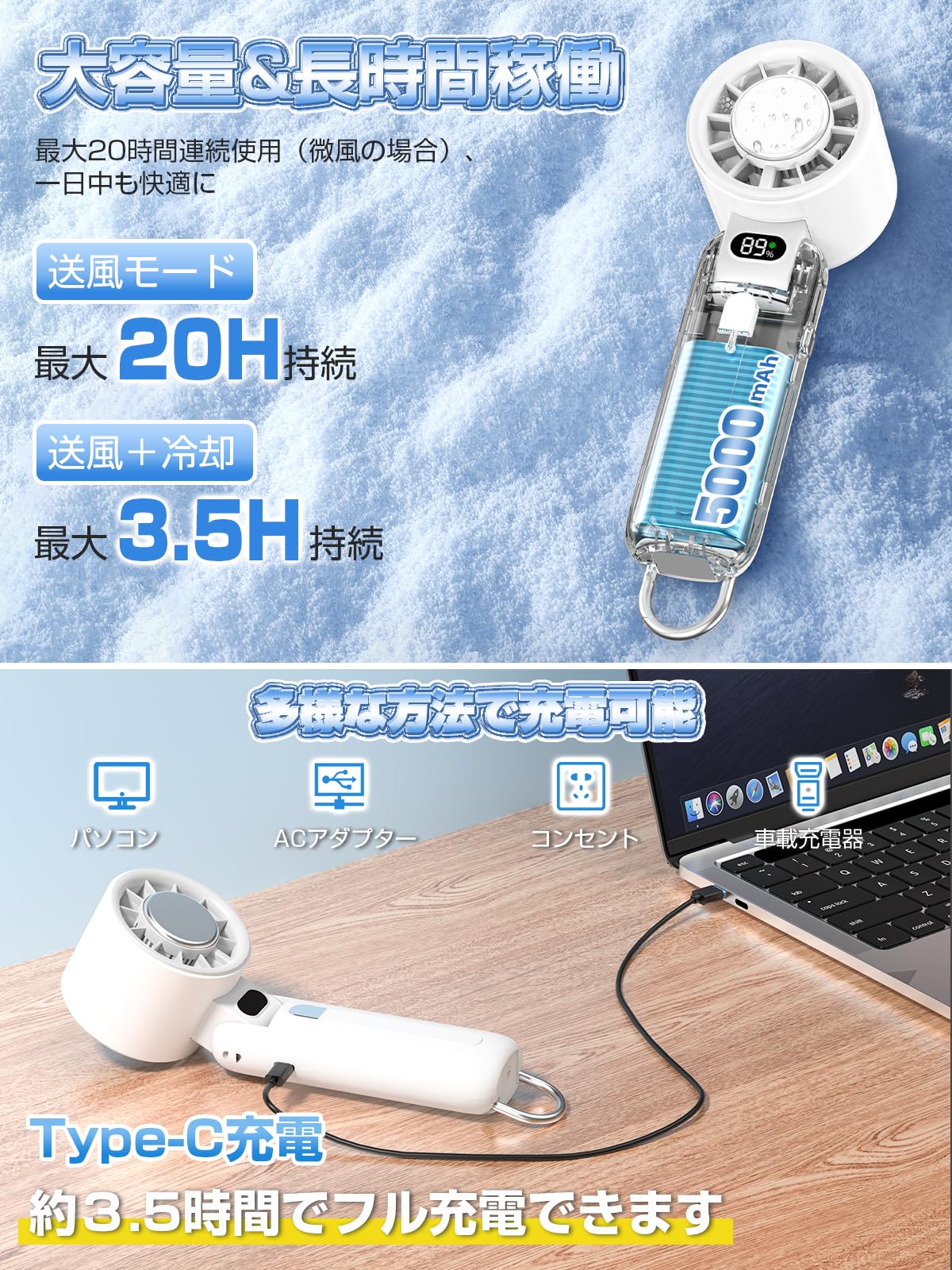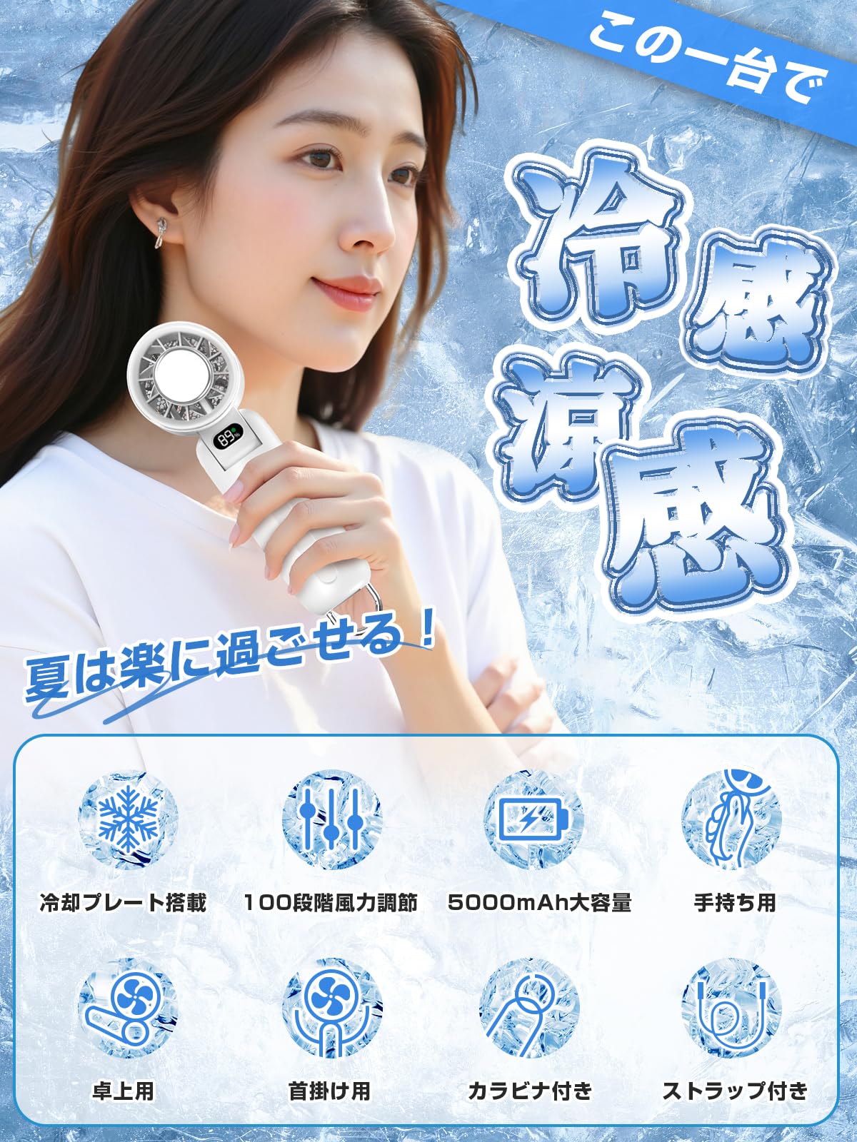 【2025新型】 ハンディファン 冷却プレート付き 携帯扇風機 冷感 手持ち扇風機 小型 強力 100段階風力 160°折り畳み 5000mAh 長時間稼働 LED残量表示 USB充電式 暑さ対策 卓上 首掛け カラビナ付き ストラップ付属 ホワイト