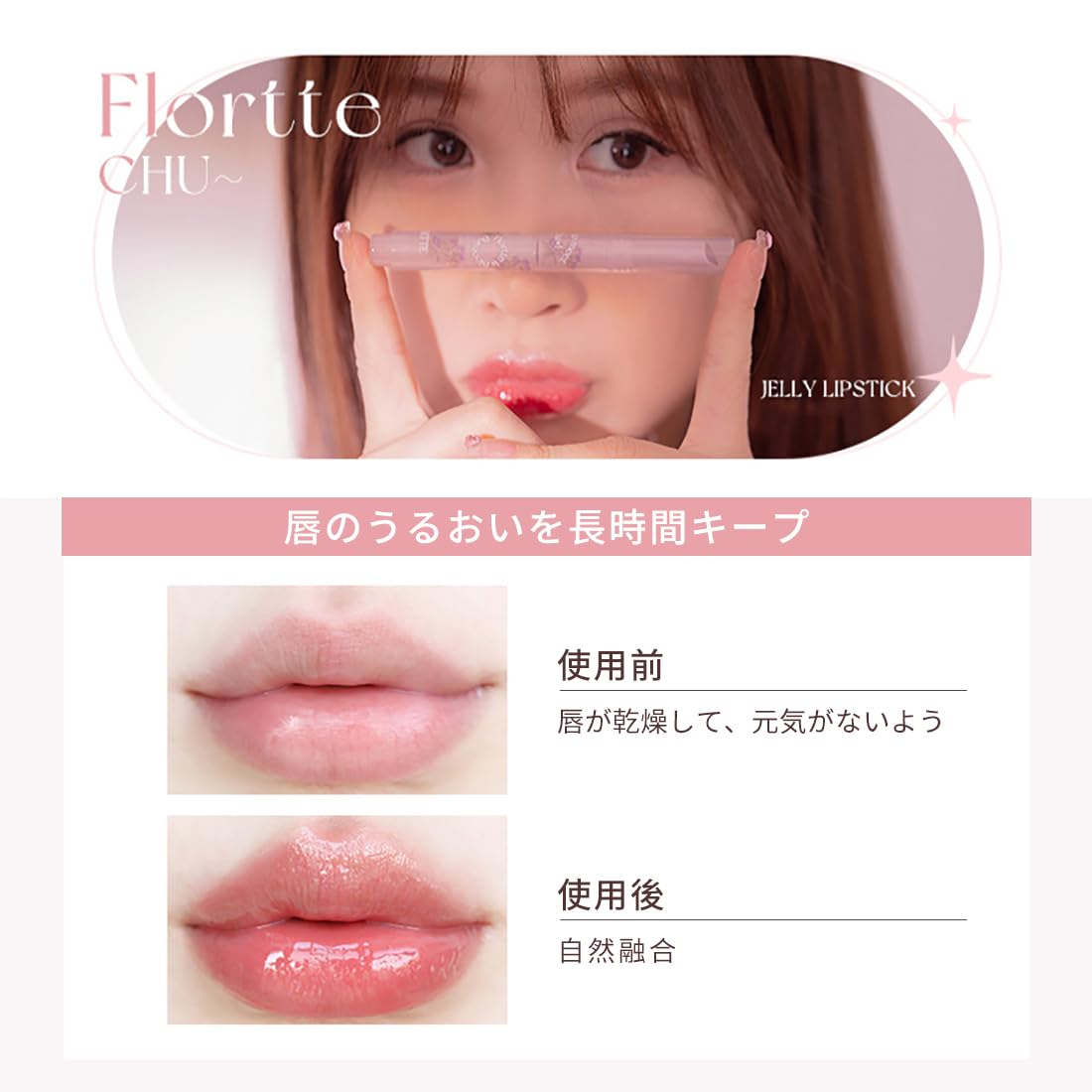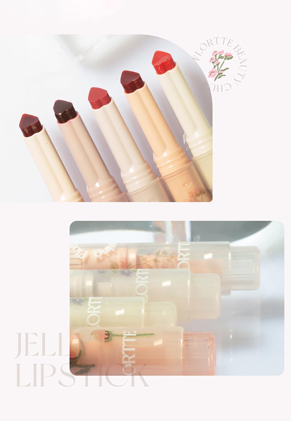 1.【ジェリー リップスティック】:ファーストキスシリーズのラブリップスティック。ジェリーリップスティックで唇を明るく、修復し、保湿します。このフロレット ジェリー リップスティックは唇に栄養を与え、唇のライン、ふっくら感、形を隠します。