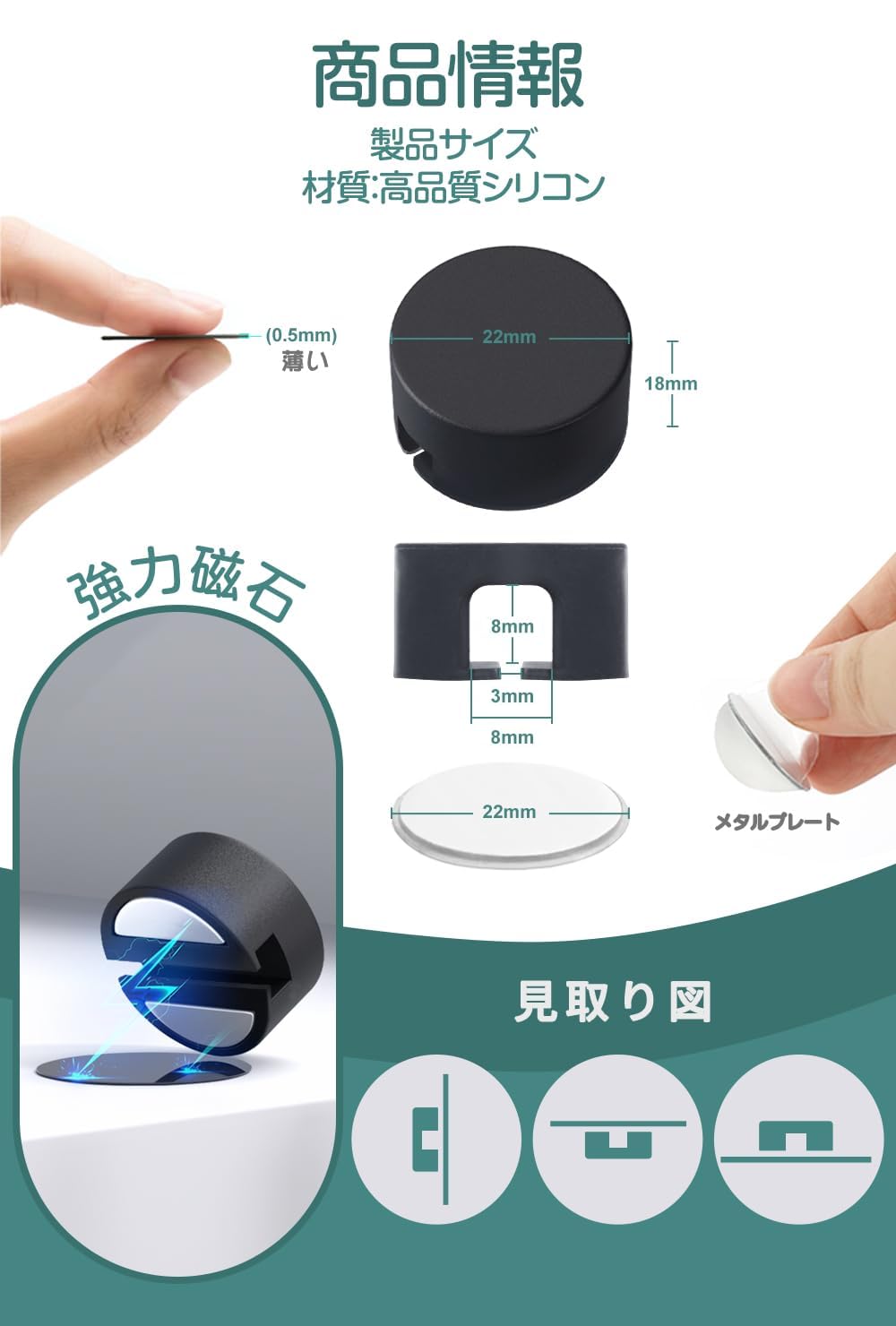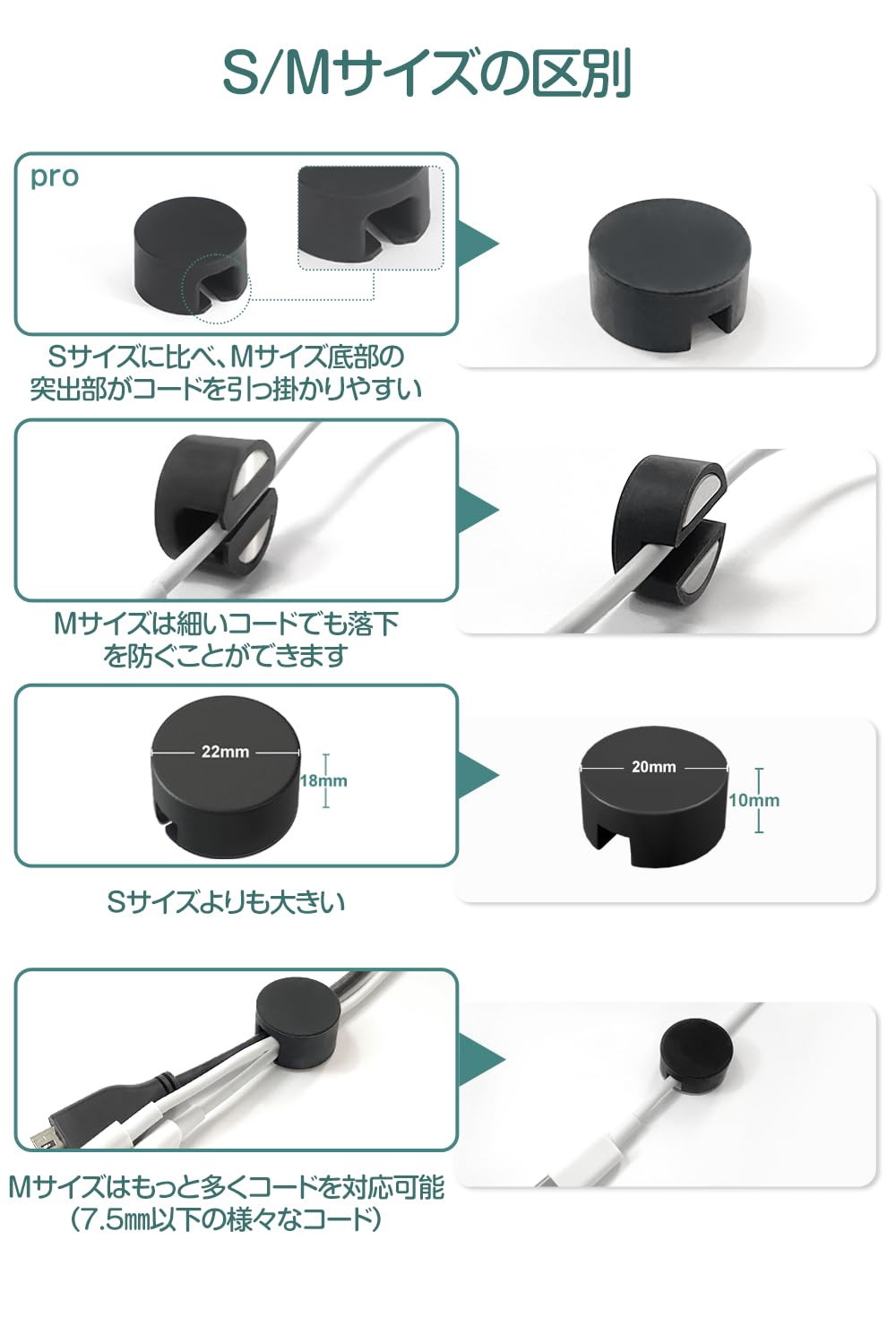 【優れた素材】製品には露出した強力な磁石が2つ組み込まれており、包み隠しの設計よりも強力な磁力を誇ります。これにより、ケーブルを引っ張っても安定して留めることができます。本体は高品質なシリカゲルで作られており、Sサイズより最大7.5mmまでのケーブルに対応しています。底部の突出部がコードを引っ掛かりやすい。滑らかでバリがなく、収納したケーブルを簡単に引っ張ることができ、阻害感もありません。
