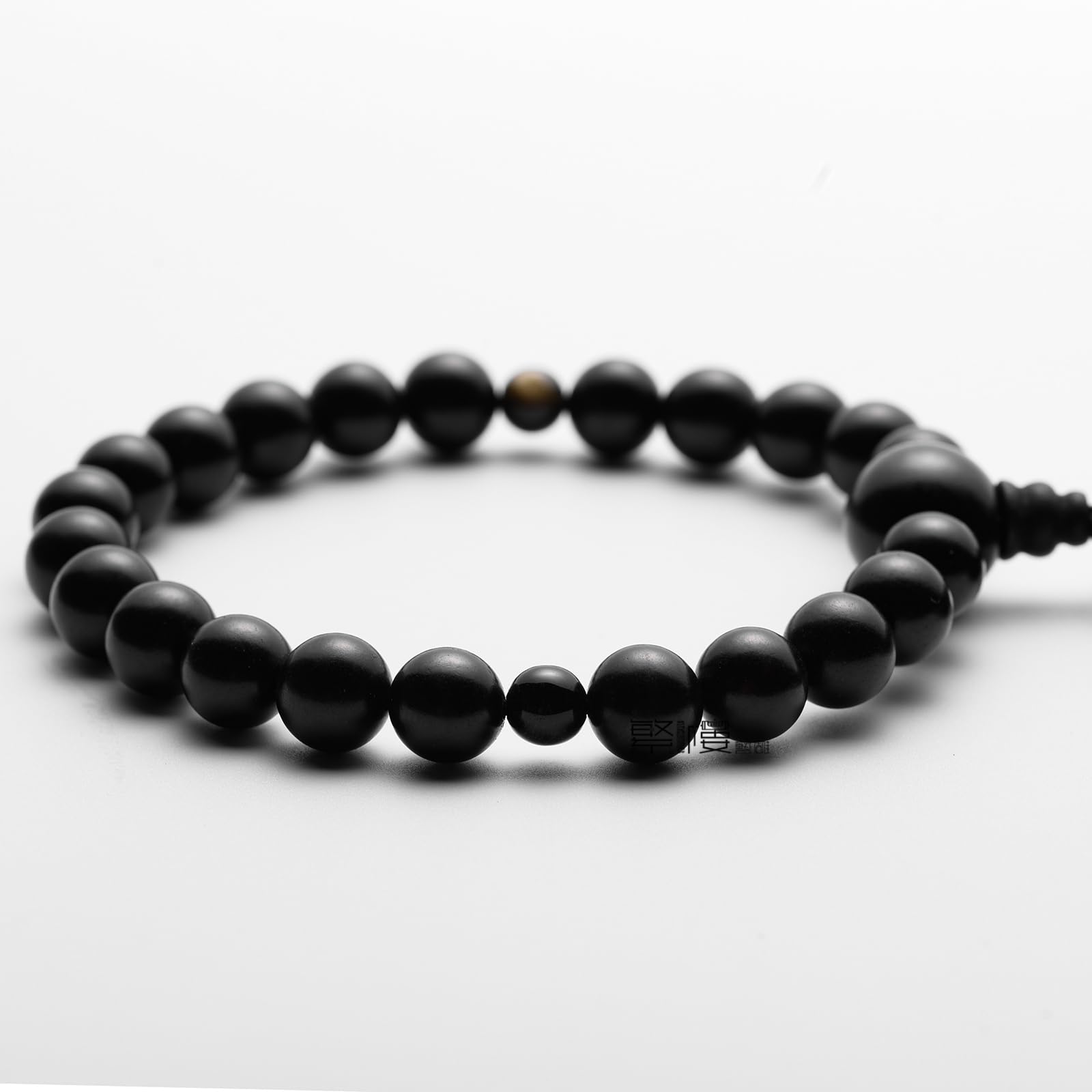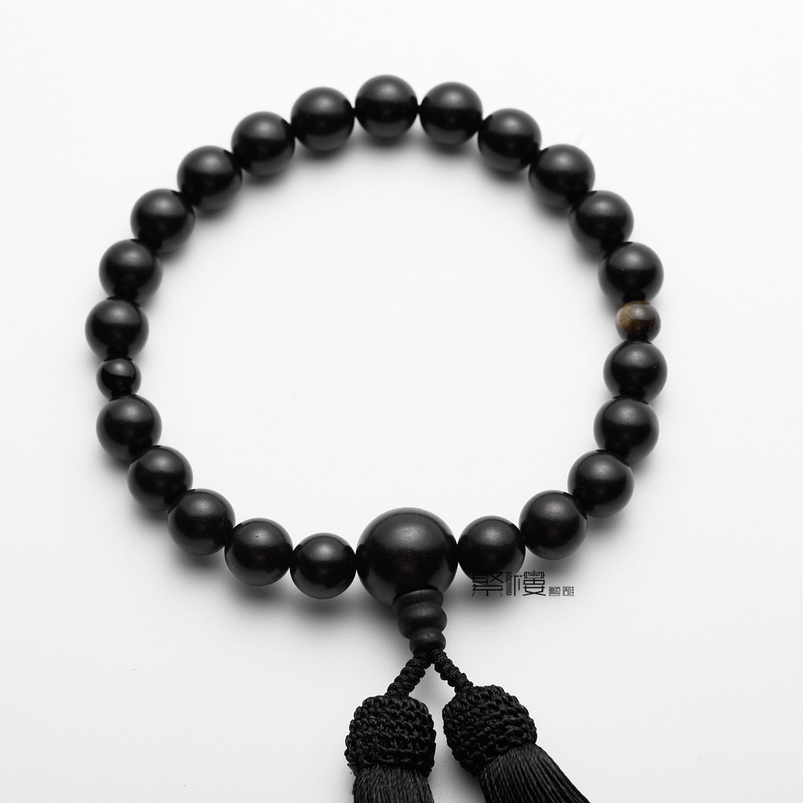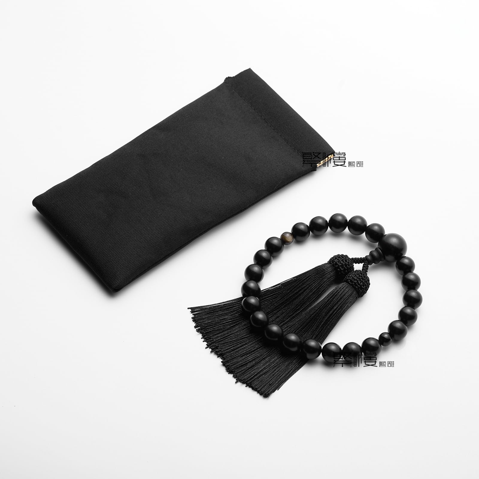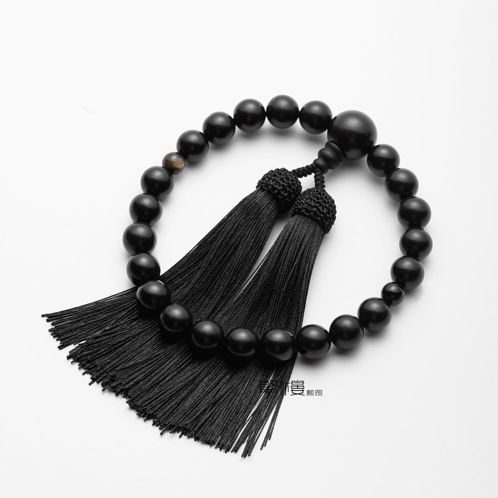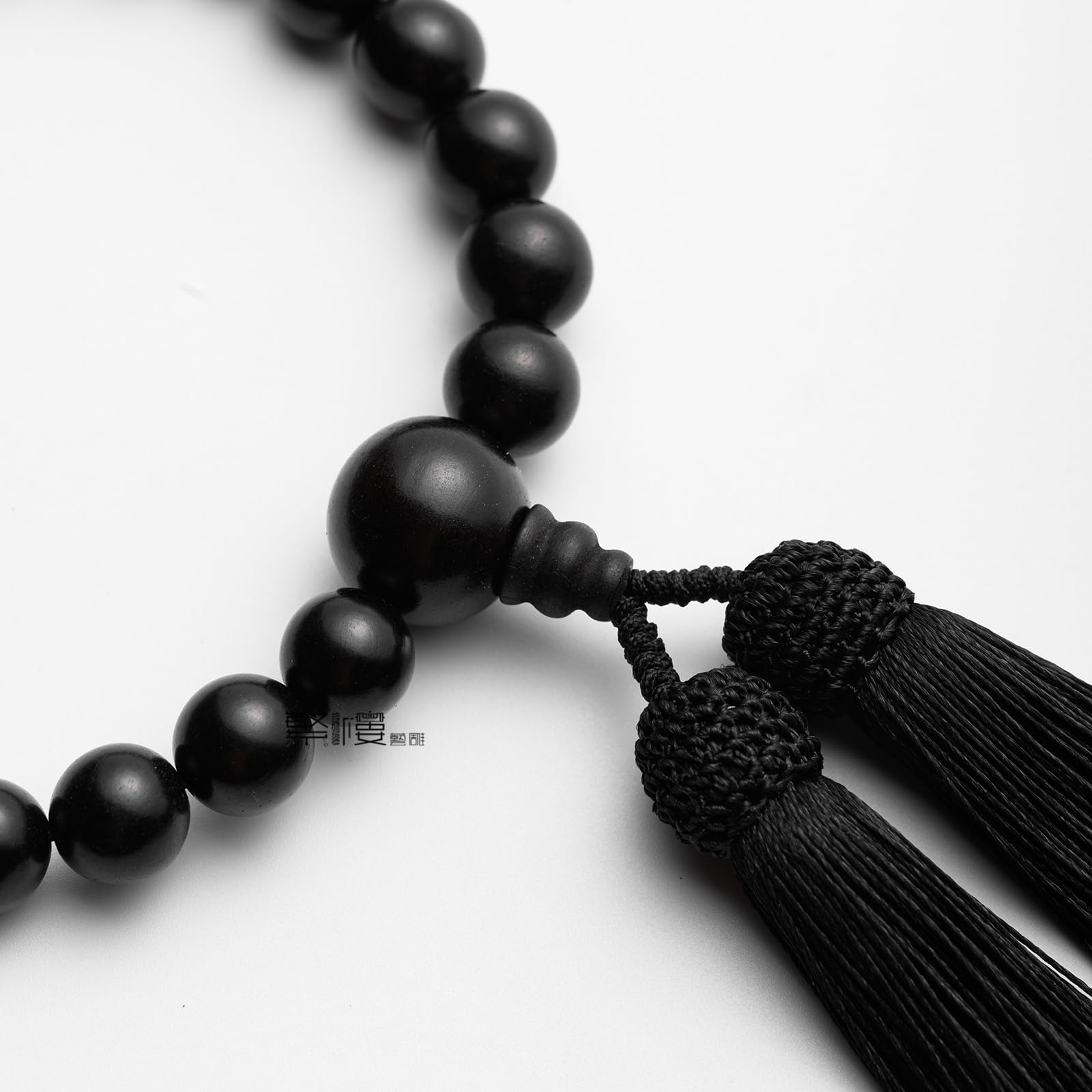 念珠の材料:念珠は全部本場の黒木から作られ、中には18ミリメートルの親珠を1個、12ミリメートルの主珠を22個、また8ミリメートルの天珠を2個含み、共に25個となり、お客様の都合のため、念珠袋(17.5cm*8.5cm)も付けます。