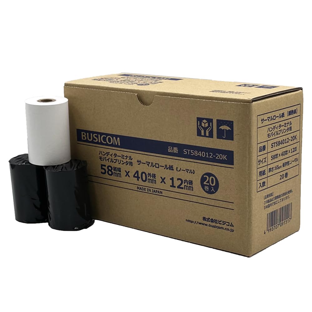 【特価在庫】ビジコム純正 三菱製紙国産 感熱レジロール紙 58mm幅×外径40φ×内径12mm 20巻 芯あり ノーマル保存 モバイルプリンター 決済端末対応 レジロール レシートロール ST584012-20K | GIGATERA