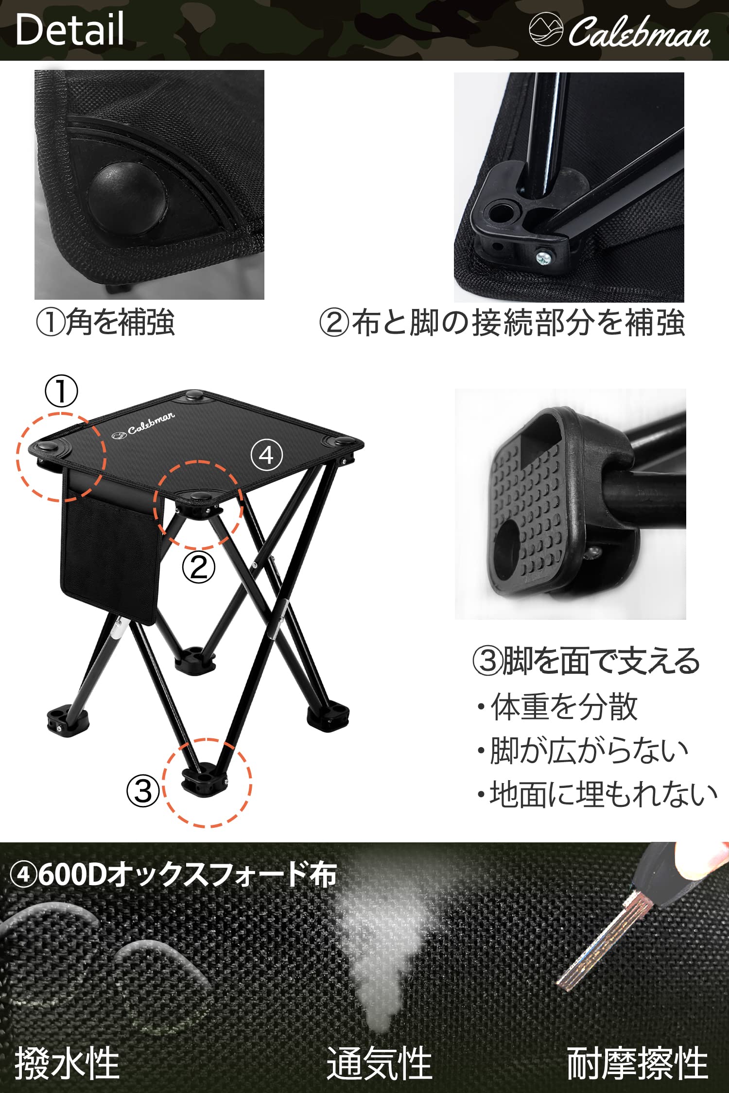 【ここを改良!4つ脚で丈夫&補強を追加】一般的な3つ脚から4つ脚に改良しました。①体重が分散されるため、座った時の安定性が格段に増しました。②3つ脚の体重がかかると広がりやすいという欠点を、4つ脚にすることで改善。③布と脚の連結にはヒンジを取付け補強を行いました。④脚の着面は点で支えるのではなく、面で支えられるパーツを取付けました。土の上でもイスが沈まずお使いいただけます。