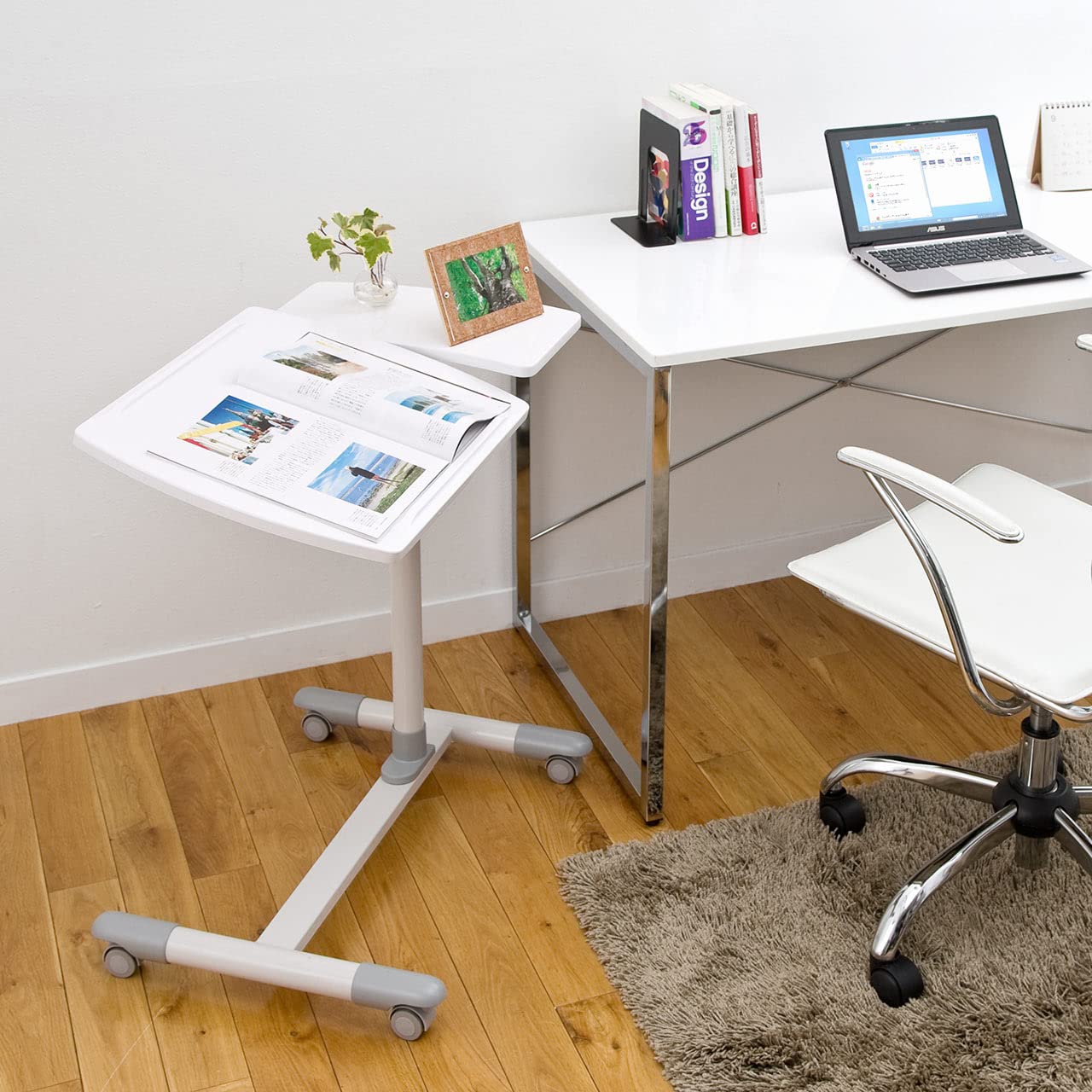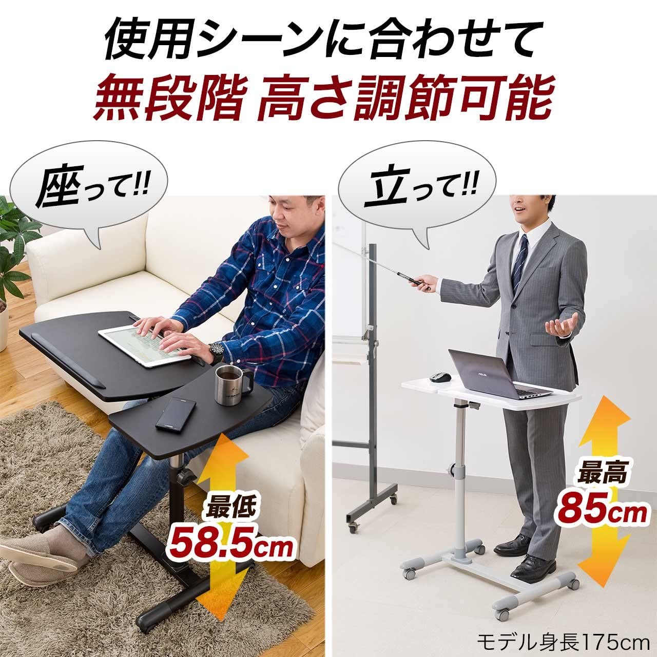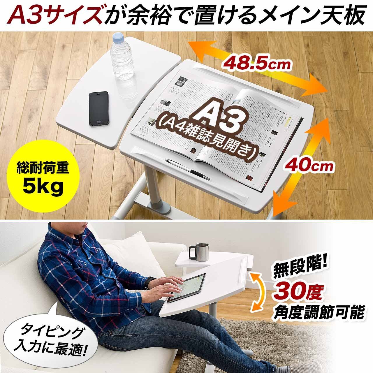 サンワダイレクト サイドテーブル 昇降式 高さ57〜83cm A3/15.6型PC対応 角度調整天板+角度固定天板 キャスター付き ホワイト 100-DESK040