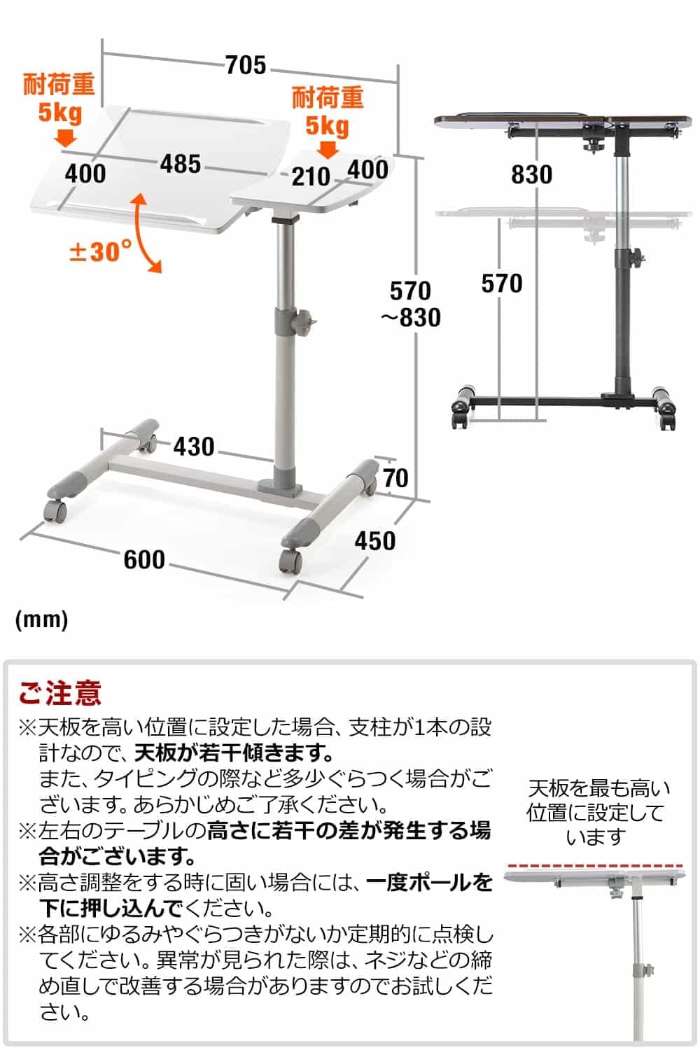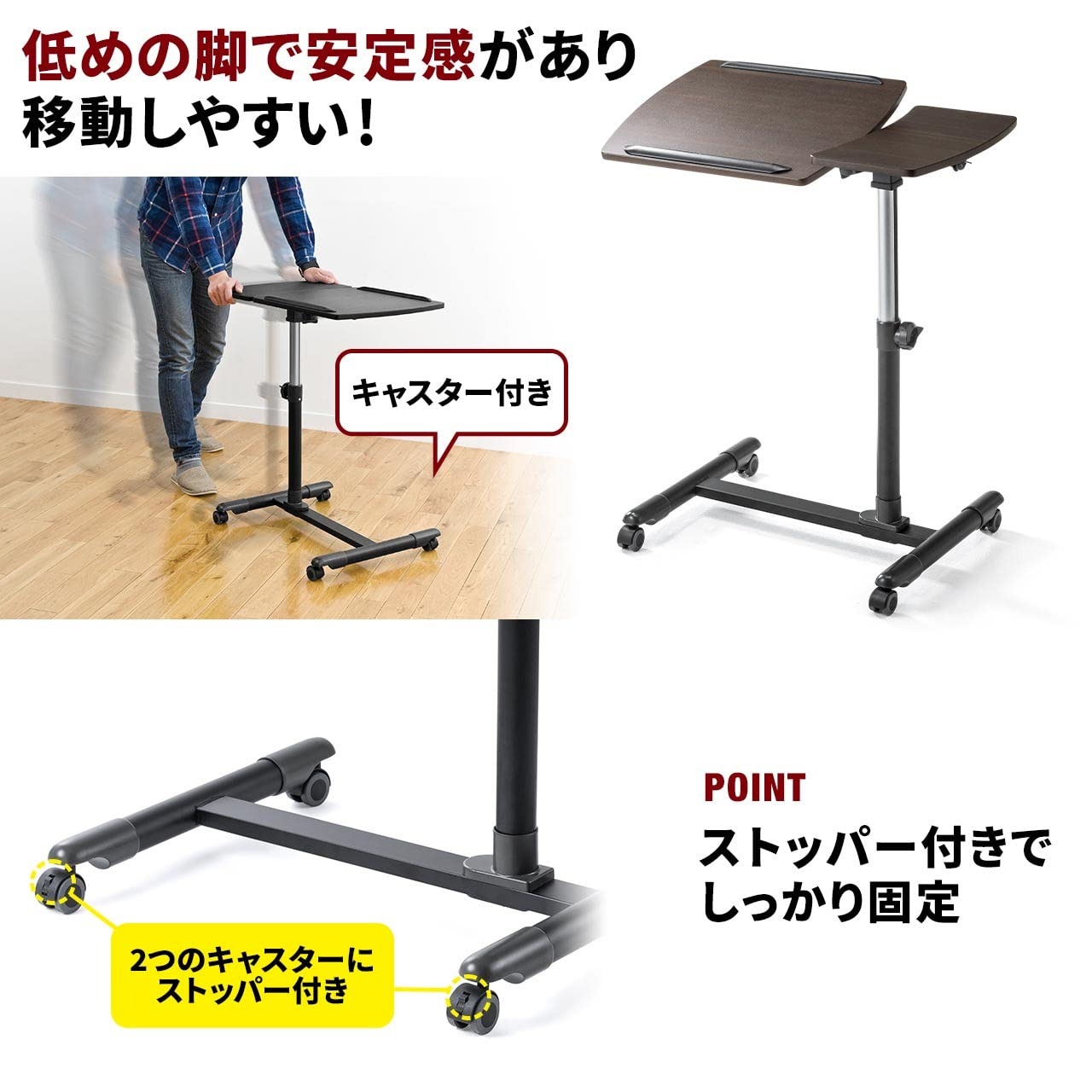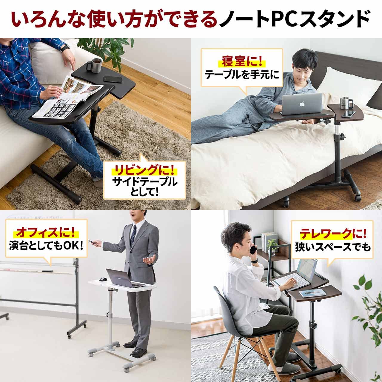 【セール】サンワダイレクト サイドテーブル 昇降式 高さ57〜83cm A3/15.6型PC対応 角度調整天板+角度固定天板 キャスター付き ホワイト 100-DESK040
