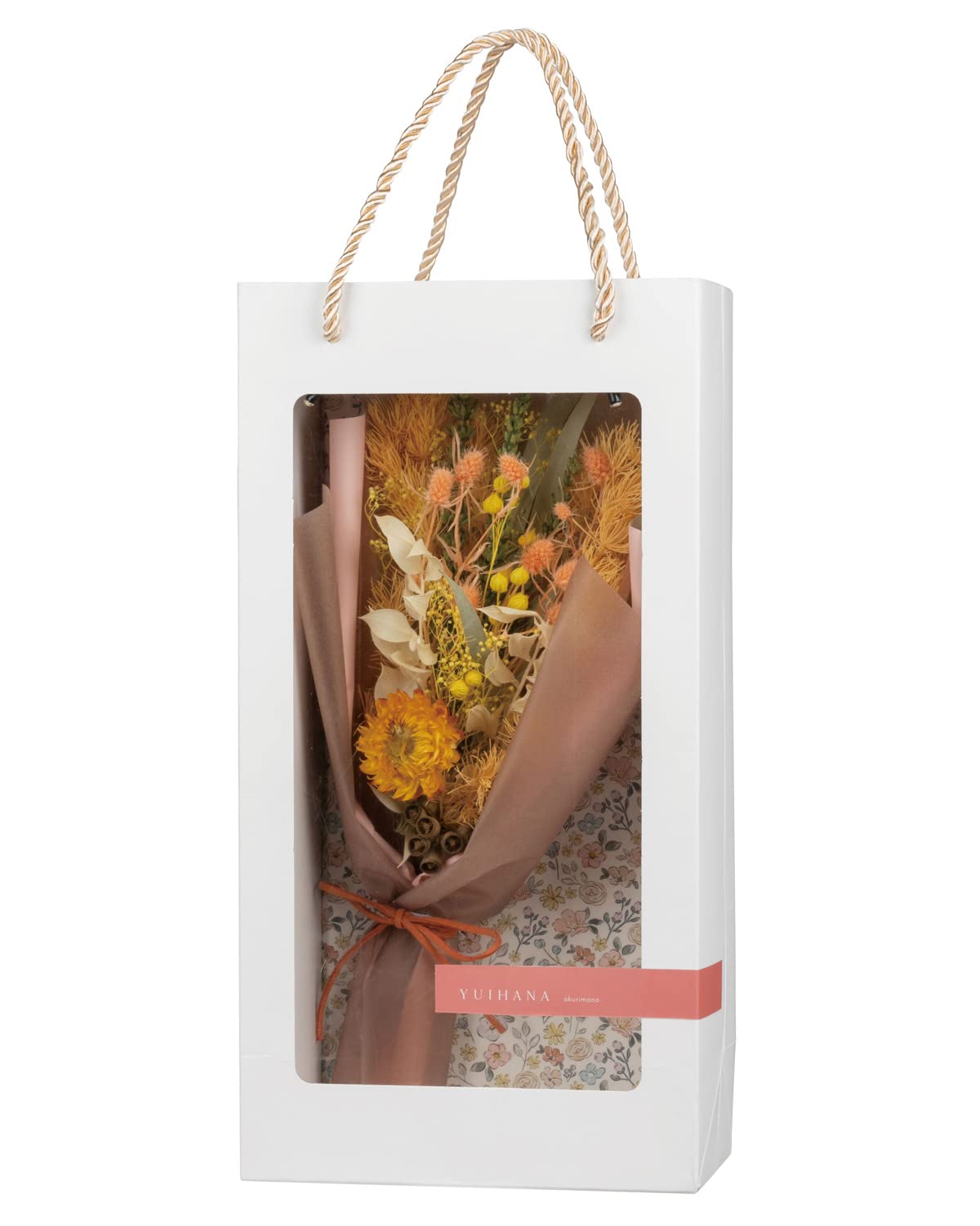 大切な想いに結びを込めて・・・「キモチを包む贈り物」シリーズ。お花に想いをのせて、大切な人へのプレゼントに。お花をラッピングで包み込み、華やかな印象に。ボリュームもあるので、感謝を伝える花束にぴったりです!ドライフラワーとプリザーブドフラワーの組み合わせなので、長く楽しめるのも魅力の一つ。中身の見えるギフトボックスに手さげがついてるので、そのままギフトとして渡せるのもポイントです。自然素材の為サイズ・色等が個々にバラつく可能性がございますので、ご了承ください。また、運送により花の一部が外れる場合がございます。【使用上の注意】高温多湿の場所、直射日光があたる場所を避けてお楽しみください。