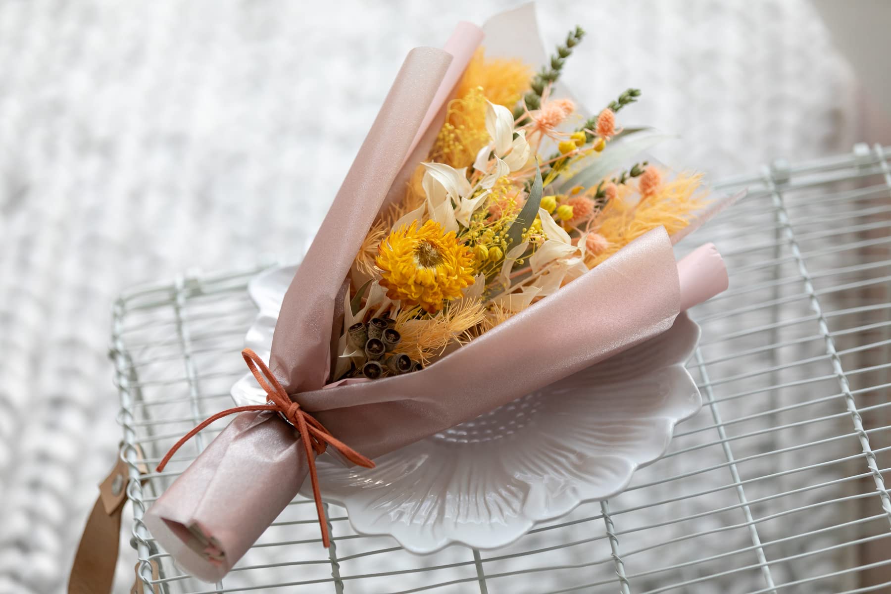 【人気のドライフラワー】ドライフラワーとプリザーブドフラワーを束ねてブーケにアレンジ。そのまま飾っても良し、吊るして今人気のスワッグとして楽しむも良し。