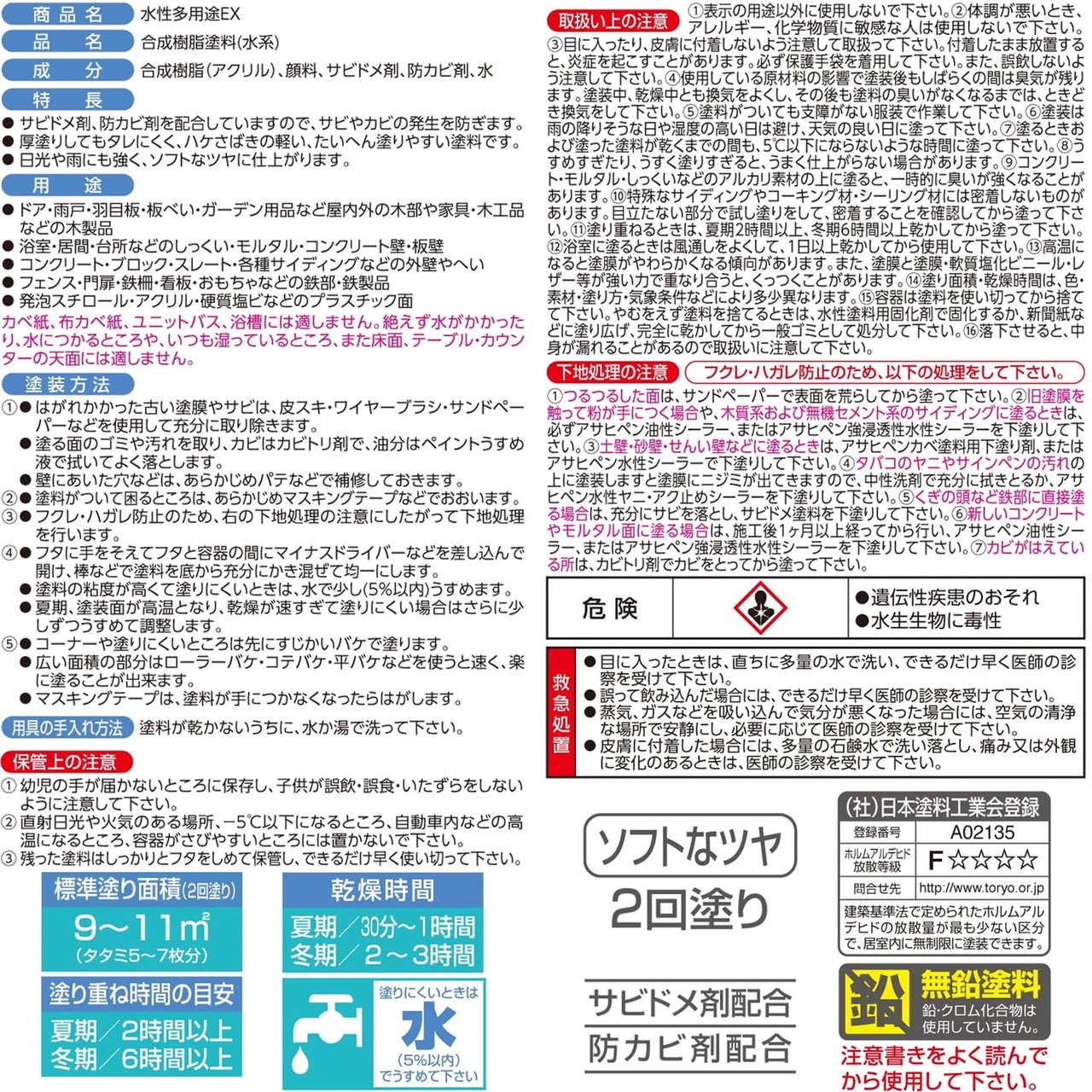 用途:(屋内外区分:屋内外用)ドア、雨戸、羽目板、板べい・ガーデン用品など屋内外の木部や家具・木工品などの木製品。浴室・居間・台所などのしっくい・モルタル・コンクリート壁・板壁。コンクリート・ブロック・スレート・各種サイディングなどの外壁やへい。フェンス・門扉・鉄柵・看板・おもちゃなどの鉄部・鉄製品。発泡スチロール・アクリル・硬質塩ビなどのプラスチック面。