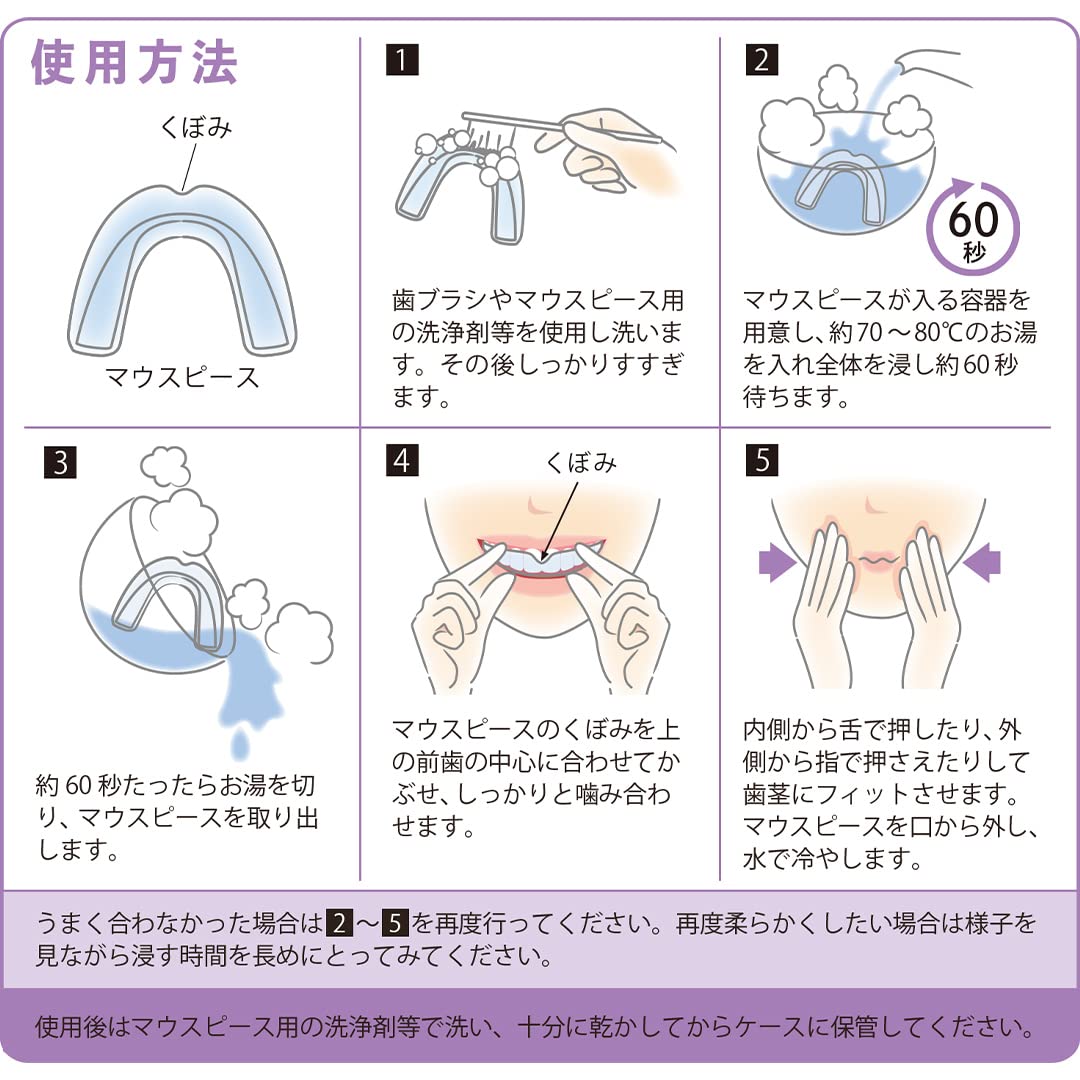 【簡単型取り】70?80℃のお湯に入れて柔らかくして、ご自身の歯に合わせて型を取るだけです。作り直しや微調整が可能なので就寝中も外れにくいです。