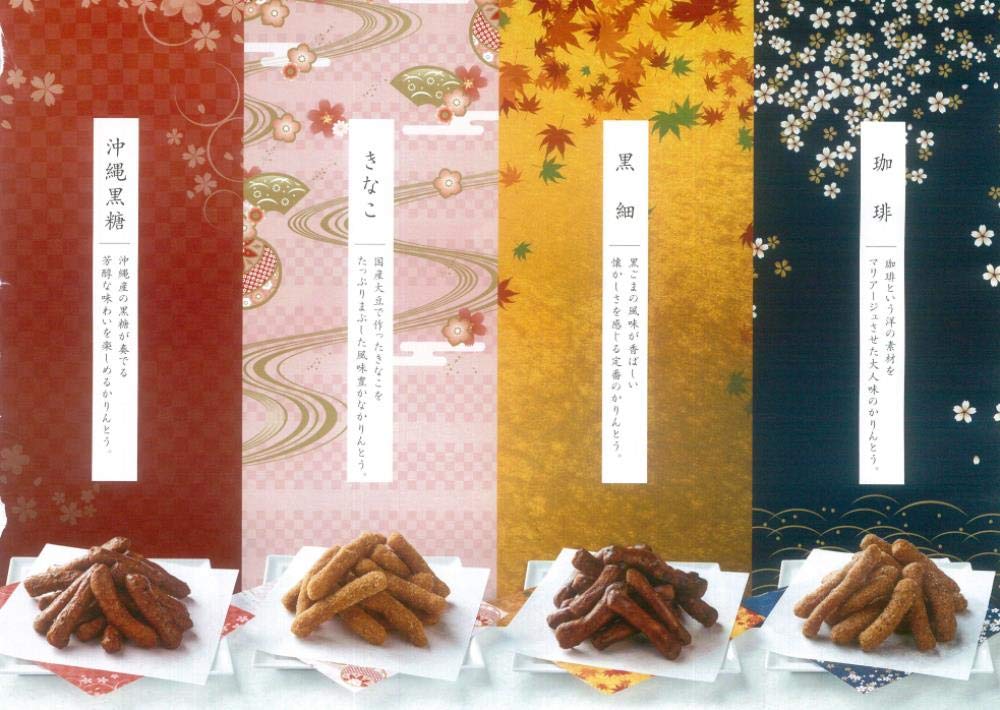 原材料:黒かりんとう50g×2、きなこかりんとう50g×1、珈琲かりんとう50g×1