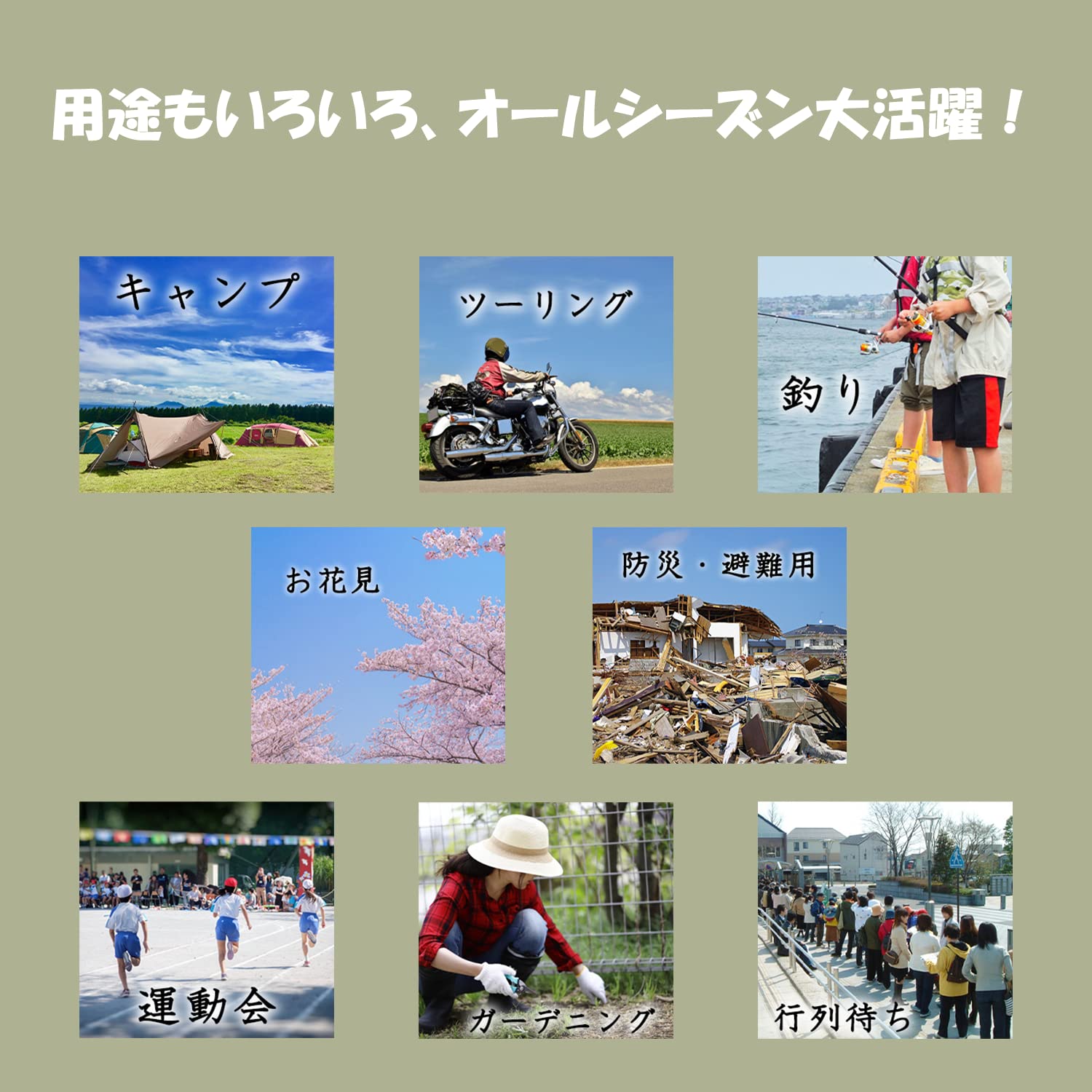 【様々なシーンで活躍】登山やキャンプ、釣り、アウトドア、旅行やツーリング、運動会、BBQ、お花見、花火、イベントの行列待ち、農作業やガーデニング、避難所