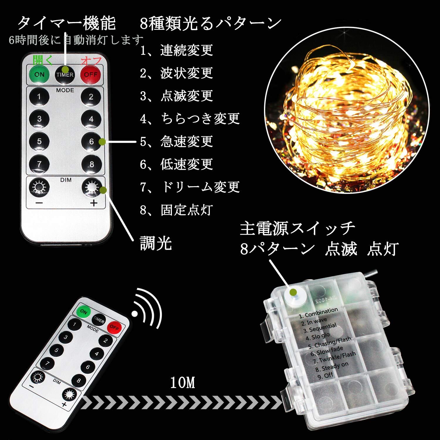 【 イルミネーションライト led パラメータ& 防水】led イルミネーションライ 電池式 、100電球 、10M、 リモコン、 8種点滅パターンが調節できる。 IP67防水なので、使用範囲がとても広いです(電池ケース部分は水に侵入できません)屋内と屋外の照明に非常に適しています。光色はワール白、LED特有の輝きで、装飾もさらに華やかである