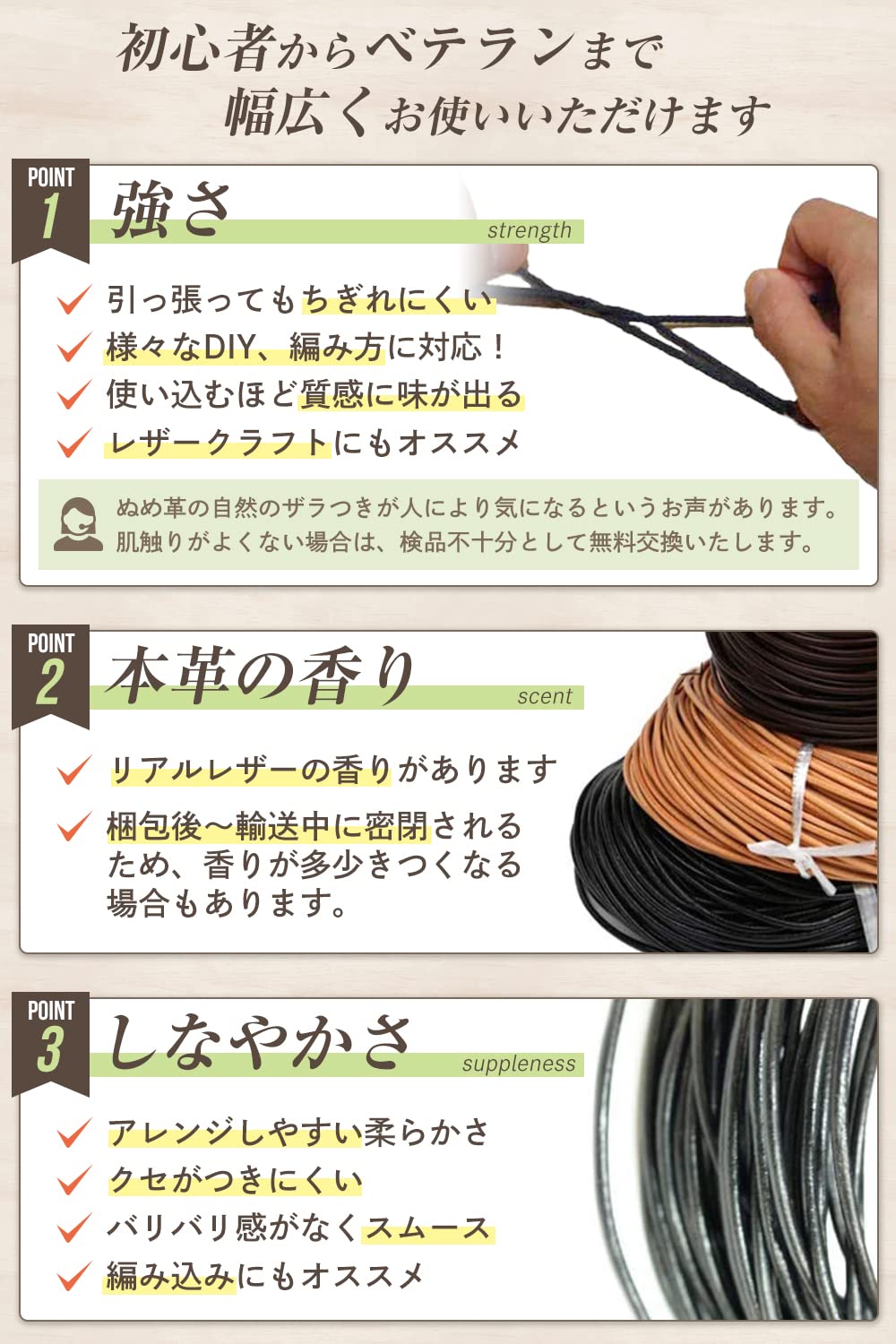 革のつなぎ目やささくれる部分、太さが少し違う部分などがある場合がございます、 天然 の 素材 を使用しておりますので、ご理解、了承の上ご利用下さい