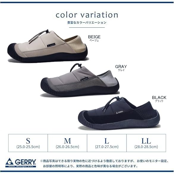 ●【カカトはゴム仕様】かかと部分がゴムになっており、踏んでも履ける2WAY仕様。サッと脱ぎ履きできて、アウトドアや室内履きにも便利。 ●【快適なふんわり中敷き】インソールは柔らかくクッション性が高く、長時間の使用でも足裏を優しくサポート。 ●【アッパーのワンポイントデザイン】シンプルながらもアウトドア感を演出するステッチ入りのワンポイントデザイン。見た目と機能を両立。 ●【履き心地の良さ】足全体を包み込むデザインで、普段履きからレジャーまで快適に使用可能。 アウトドアブランド【GERRY】のスリッポンシューズ。 カカト部分はゴム仕様になっており、踏んで履ける2WAYデザインで脱ぎ履きラクラク。ちょっとした外出からキャンプ・旅行・オフィス履きまで幅広く活躍します。 ふんわりとしたクッション性のある中敷きが足裏をやさしく支え、普段使いでも快適な履き心地。 アッパーはシンプルながらも飾りステッチが施され、アウトドア感を演出しつつカジュアルにも合わせやすいデザインです。 丈夫なラバーソールはグリップ力があり、街履きからレジャーシーンまでマルチに対応。