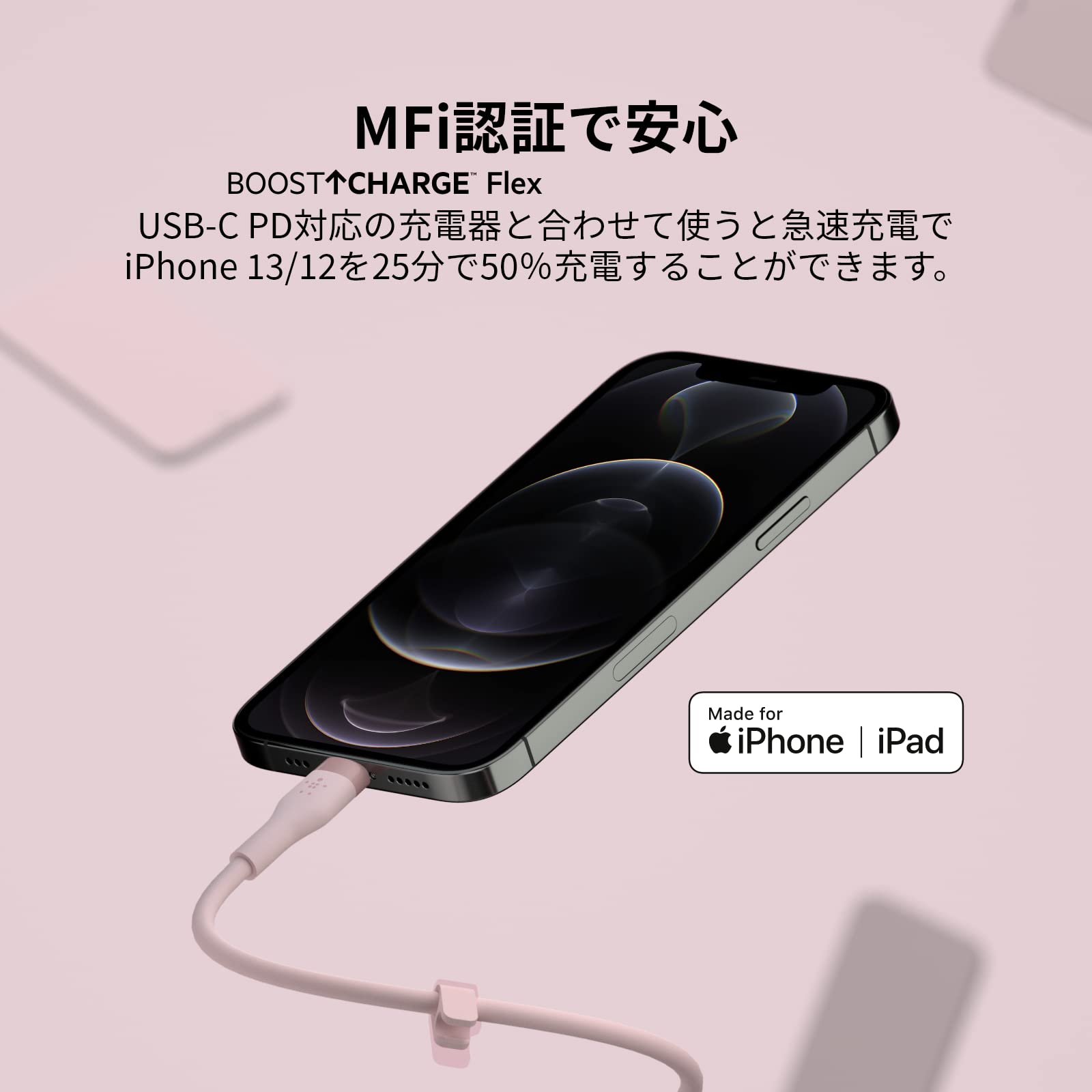 【数量限】Belkin USB-C to ライトニング シリコン ケーブル iPhone 14 / 13 / 12 / SE / 11 / XR 対応 急速充電 高耐久 MFi認証 PD対応 1メートル ピンク BOOST CHARGE↑Flex CAA009bt1MPK