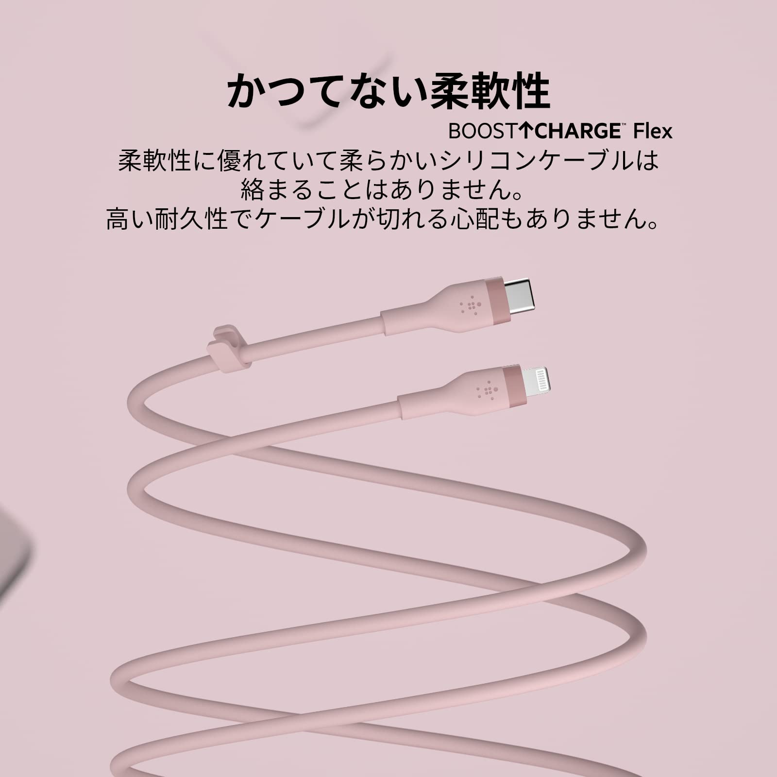 【Belkin史上最も柔らかいケーブル】シリコンの柔らかさと折り曲げ自在な柔軟性を活かして充電することができます。BelkinのBOOST↑CHARGE Flexケーブルは、シリコンテクノロジーを活用して設計された、絡まりやねじれが起きにくく、破損しにくいケーブルです。