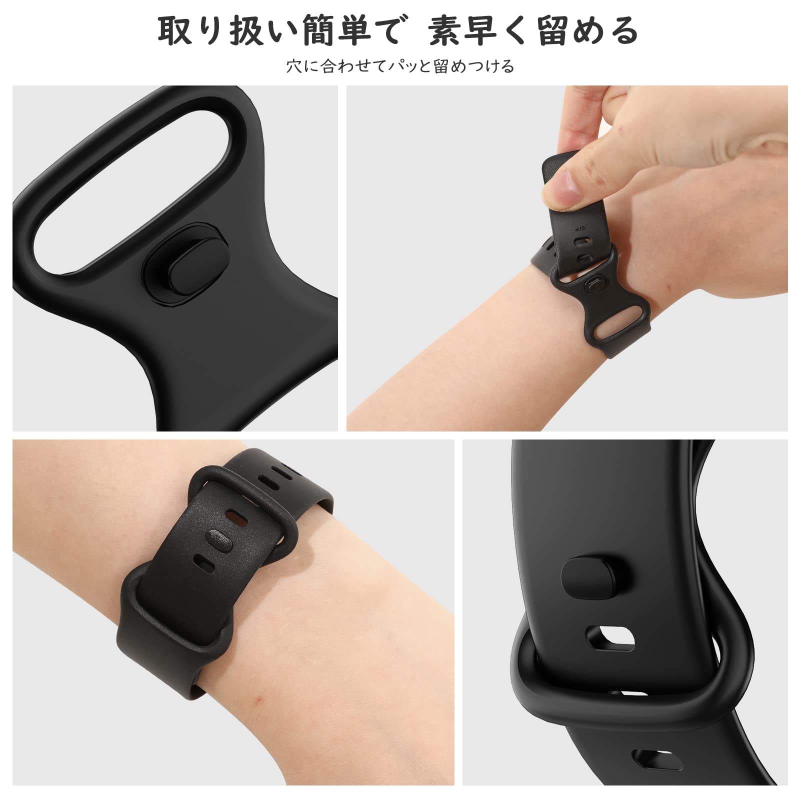 「取り付け簡単」 ツール必要なく、ピンにカチッと押し込むだけで簡単に装着できます。長さを調整できる複数の精密なカット穴が設計してあり、締め具合も必要に合わせて簡単に調節できて、バックルを穴に合わせてパッと留めます。