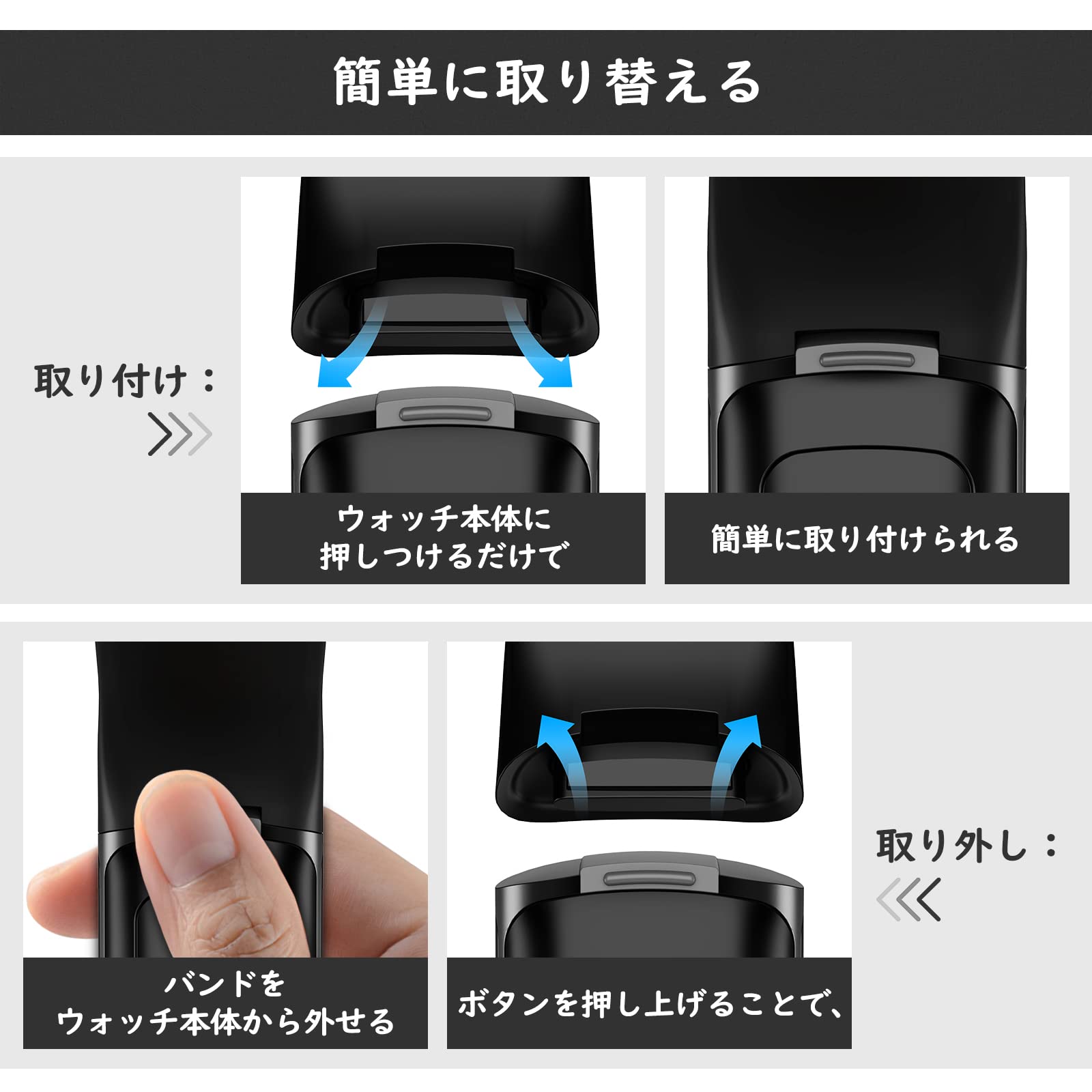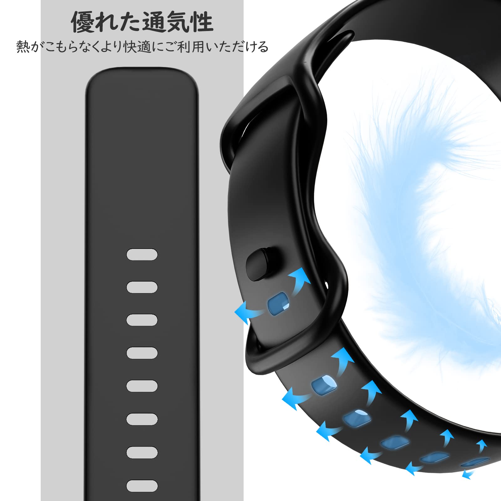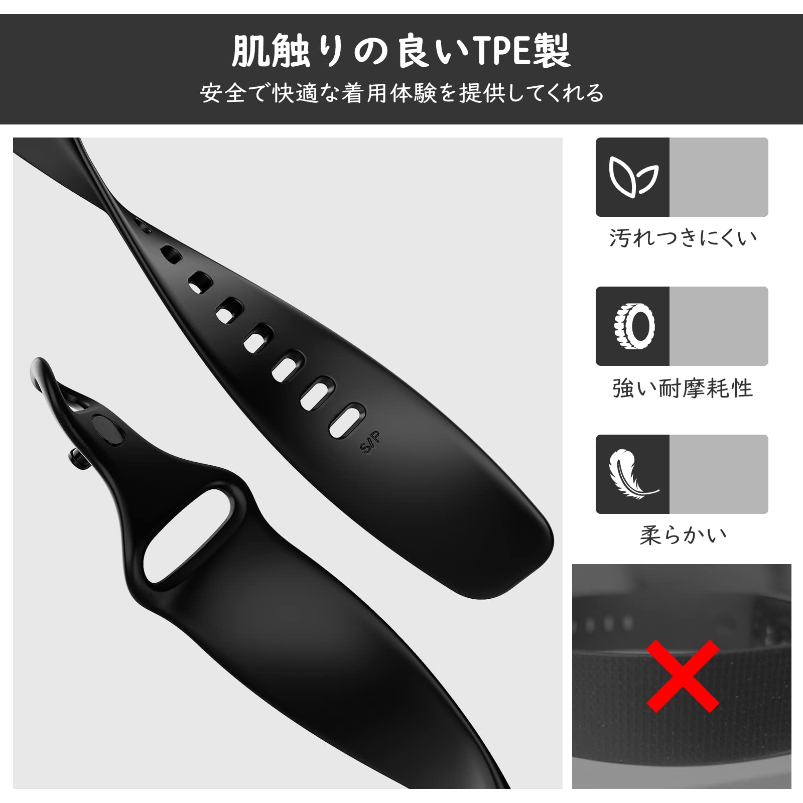 「高級TPE材質」 耐久性に優れた肌に優しく柔軟性も高い上質なTPE素材を採用しております。水を気にすることなく、直接水洗いもできて、いつでもバンドをきれいのままに保てて、ソフトで耐摩耗性も備えて、長続きにご利用いただけます。