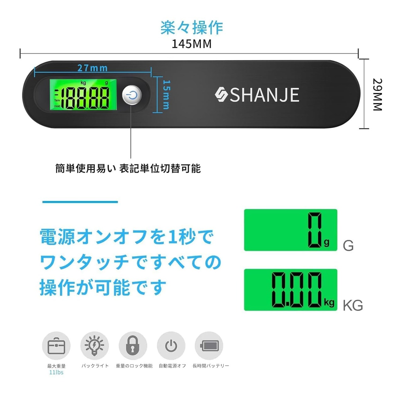 【簡単操作】ボタンひとつで、計り単位をkgからgに切換えます。計量はかりの誤差は約±30gです。持ち運びにもとても便利で、耐用性が高いです。また、電池の使用時間は改良前より30%程長くなっています。60秒間に使用しないまま、自動パワーオフします。