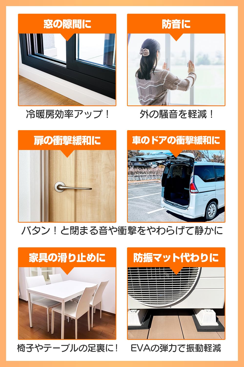 4. 多用途に使える万能設計:●窓のすき間風防止で冷暖房効率アップ。●ドアの衝撃音・車のドアバン防止。●家具の滑り止め。●家電の防振マット代わり。