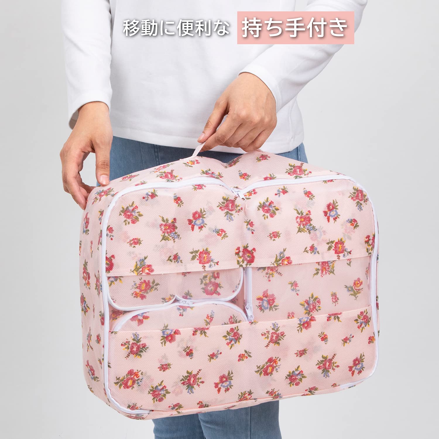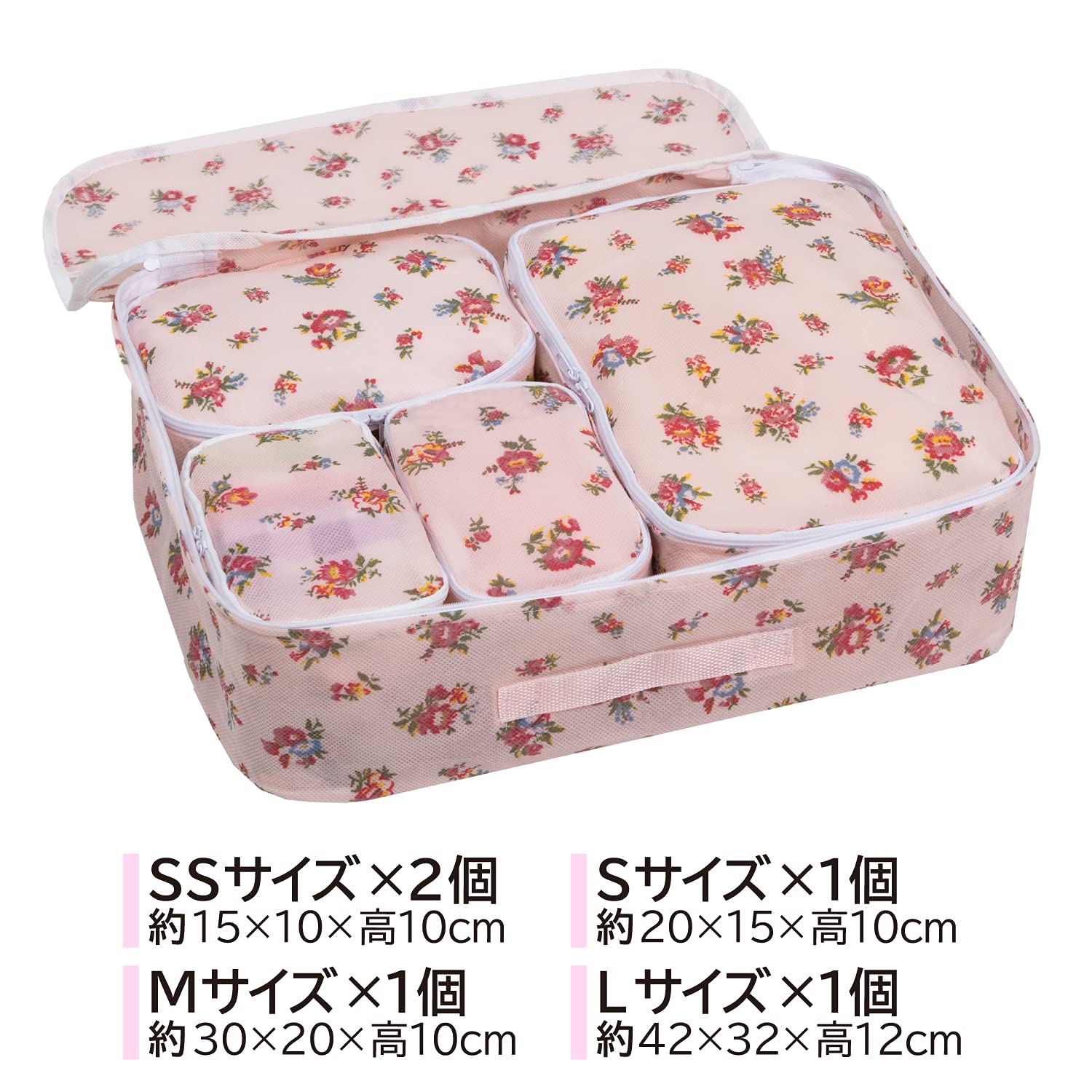 アストロ バッグインバッグ 薄ピンク 花柄 5個セット 収納ケース トラベルポーチ 小物入れ パッキング 822-66