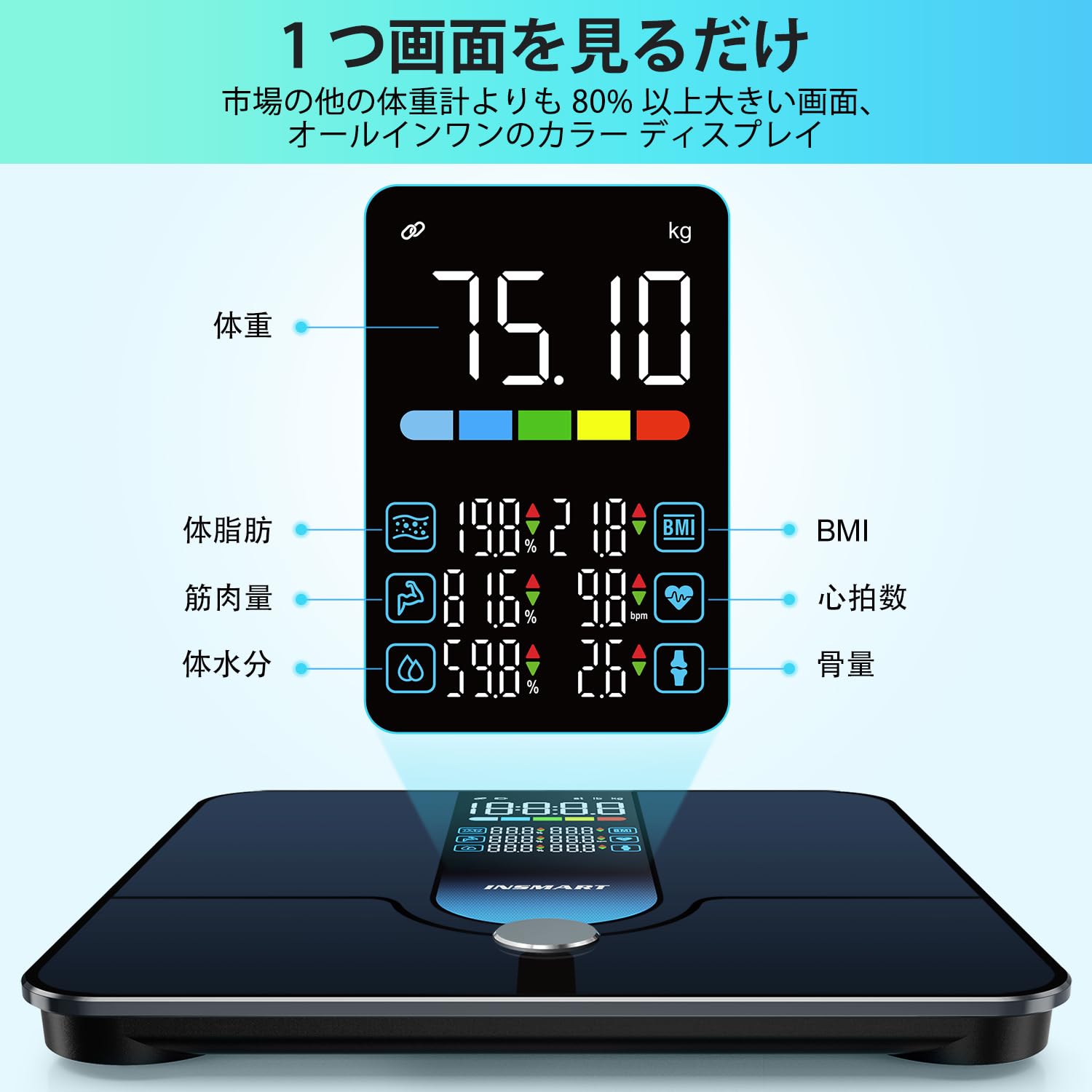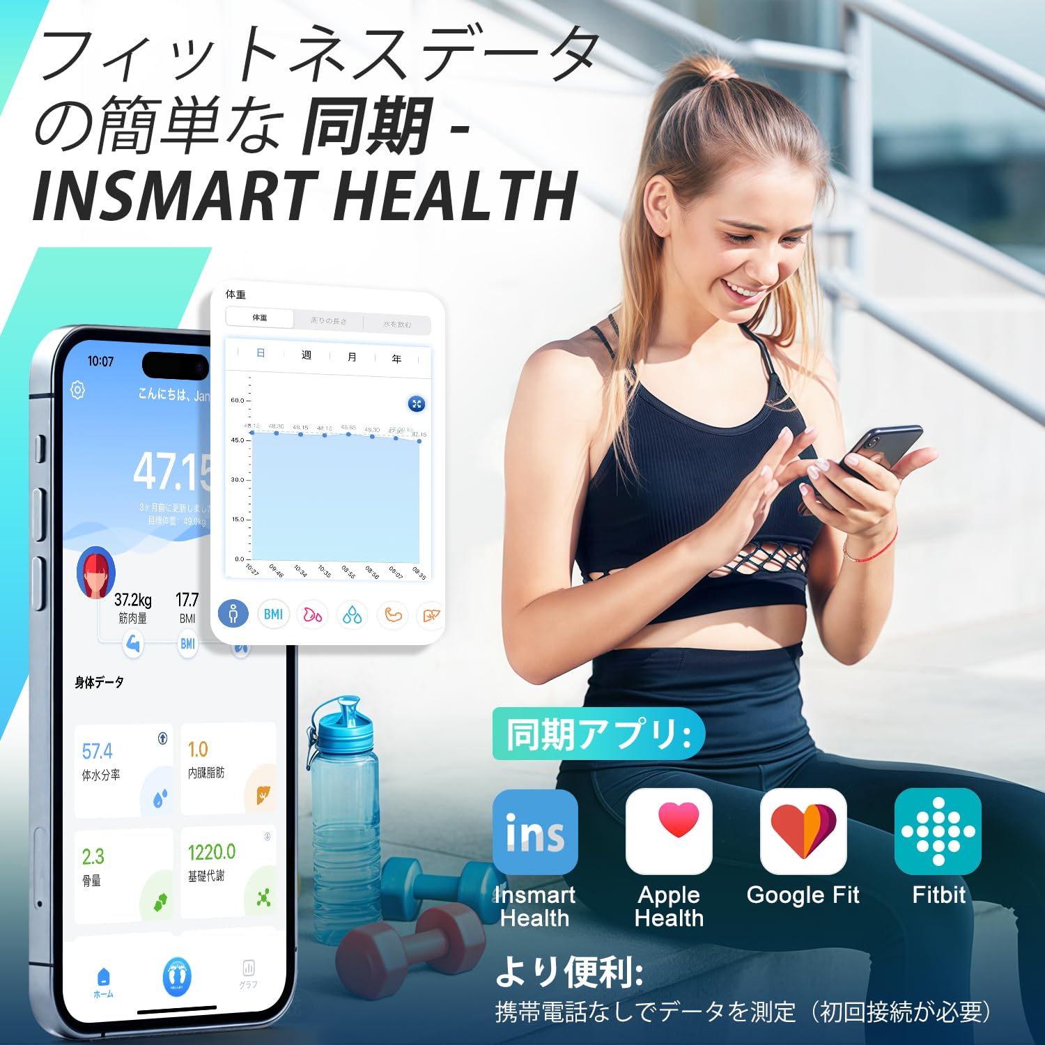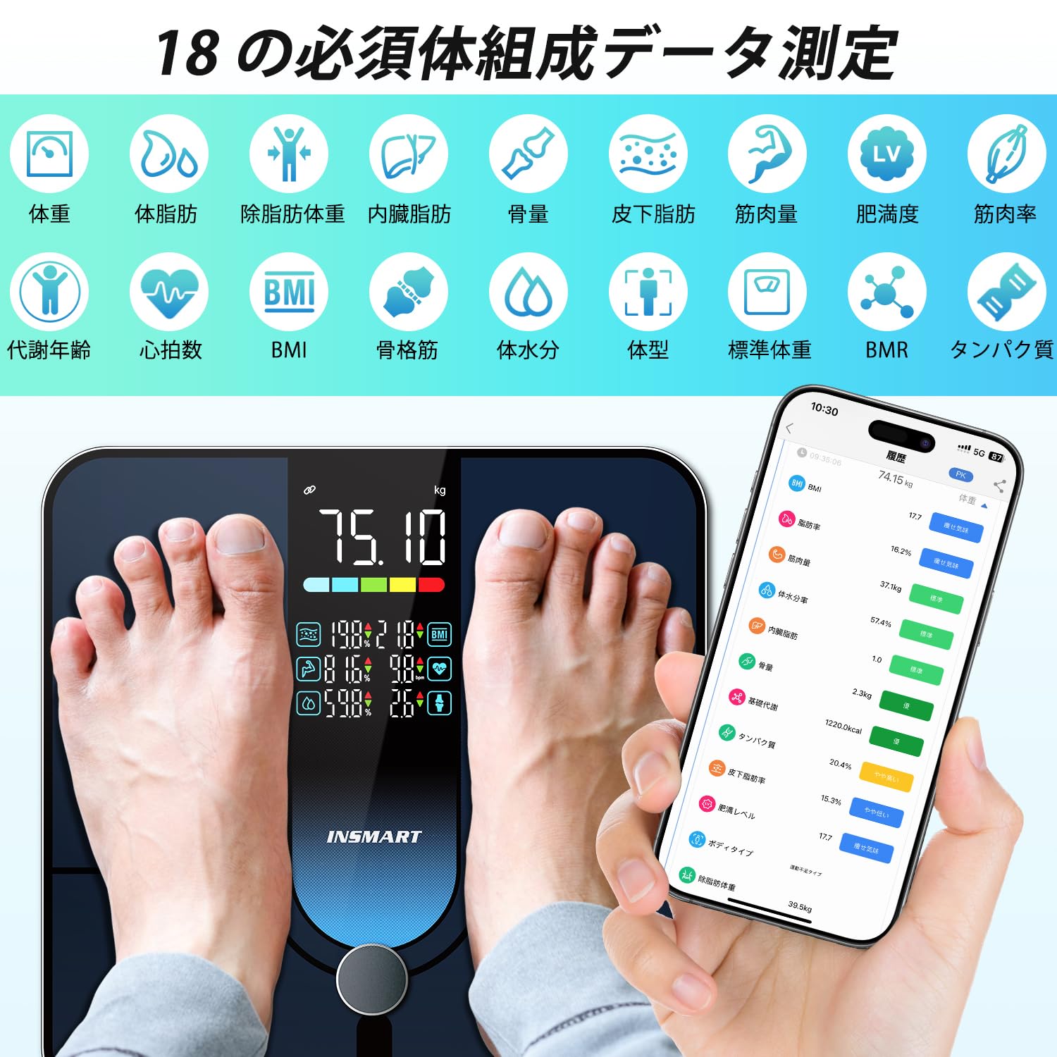 【新改革体重計&スマホ対応】App StoreからINSMART HEALTHをダウンロード、AndroidとiOSに両方対応。体重計を乗るだけBluetoothで専用アプリ内に接続すること、18項目の体の全体を測定、データを自動的にアップロードします。この体重計のデータを Apple Health、Google Fit に接続して同期し、ワークアウトや食事の記録とともに進捗状況を追跡できます