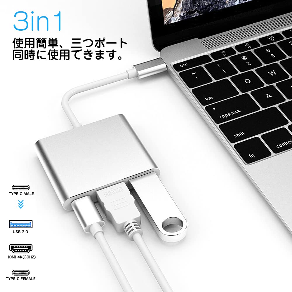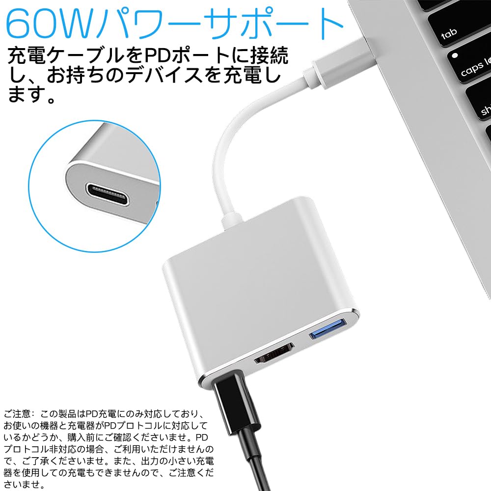 3-in-1 USB Type C HDMI 変換 アダプタ 60W マルチポートデバイス USB 3.0ポート+HDMIポート+Type c テレビ出力 4K解像度サポート 1080P 急速PD充電 UHDコンバータ シルバー iPad Pro/MacBook Pro/Surface Go/Air デバイス対応