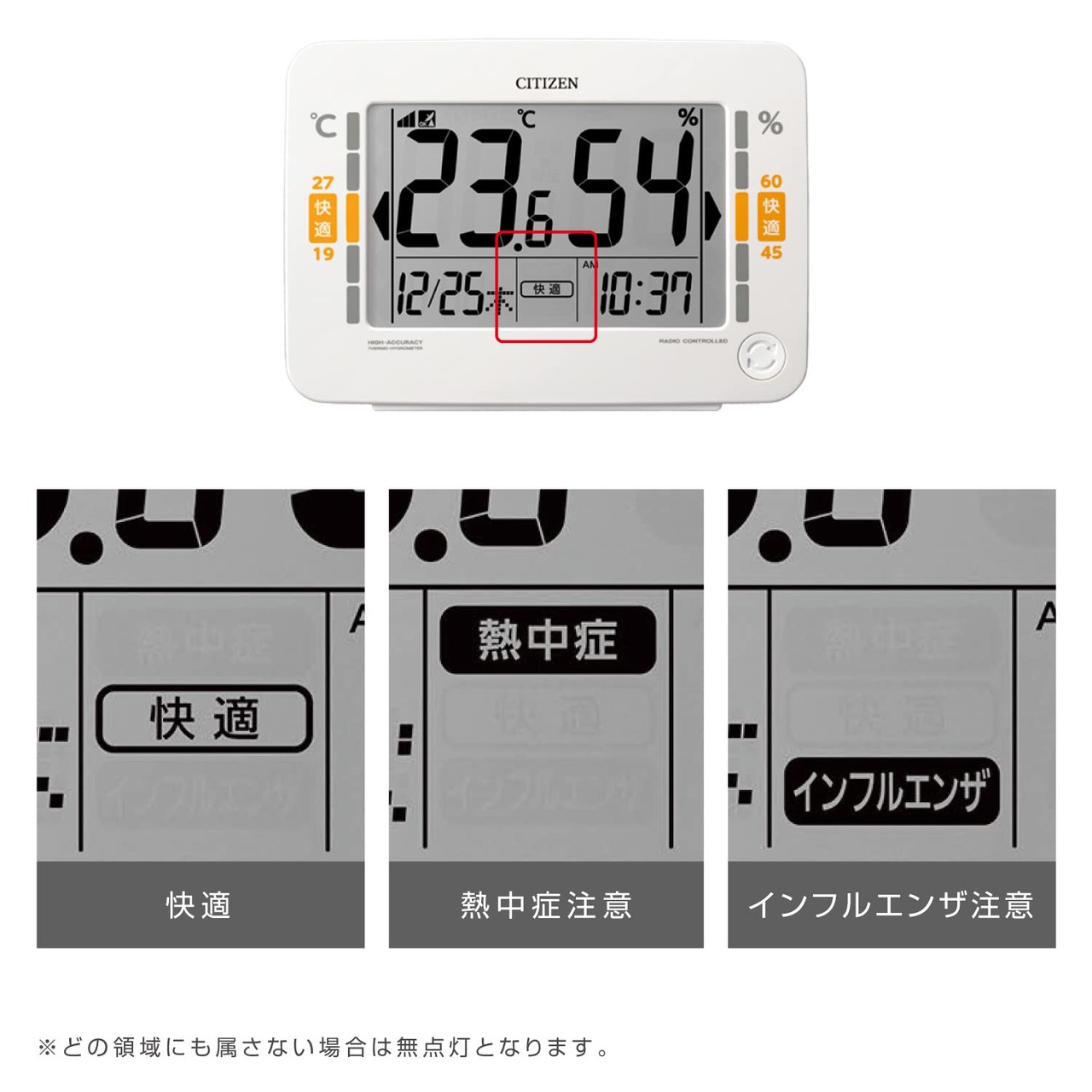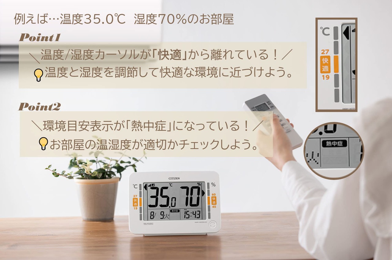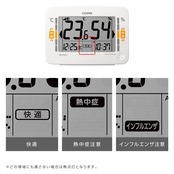【インフルエンザや熱中症の注意表示】高精度センサーを搭載し、アイコンの点灯、点滅で環境目安をお知らせします。快適な場合は点灯表示、熱中症やインフルエンザになりやすい温湿度の場合は点滅表示でお知らせ。