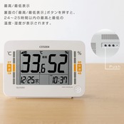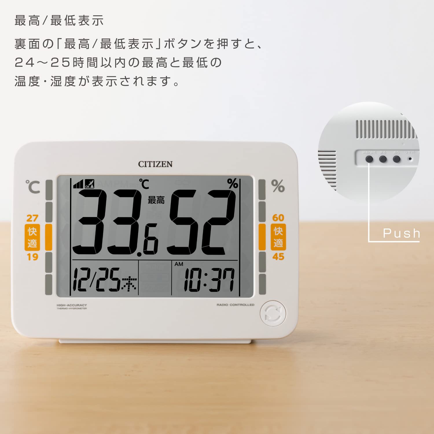 【温度と湿度の最高・最低表示】裏面のボタンを押すと、24〜25時間以内の最高と最低の温度・湿度が表示されます。翌日からのお温湿度調整に役立ちます。