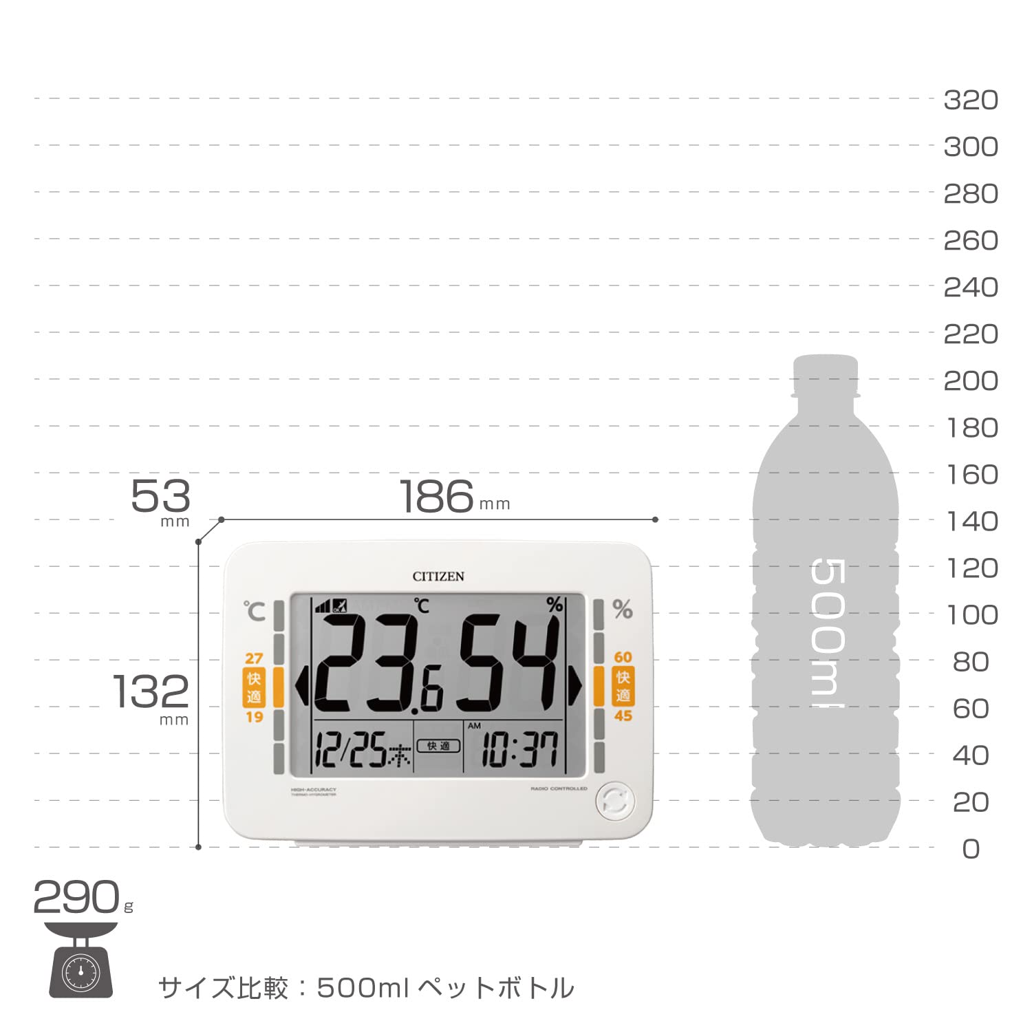 サイズ:13.2x18.6x5.3cm 質量:290g 使用電源:単3形乾電池x2本(電池別売) 温度表示(-9.9〜50℃) 湿度表示(20〜95%) カレンダー表示(2099年12月31日までプログラム) 環境目安表示(熱中症 / インフルエンザ / 快適 表示) 温度・湿度の最高/最低値表示 電波時計