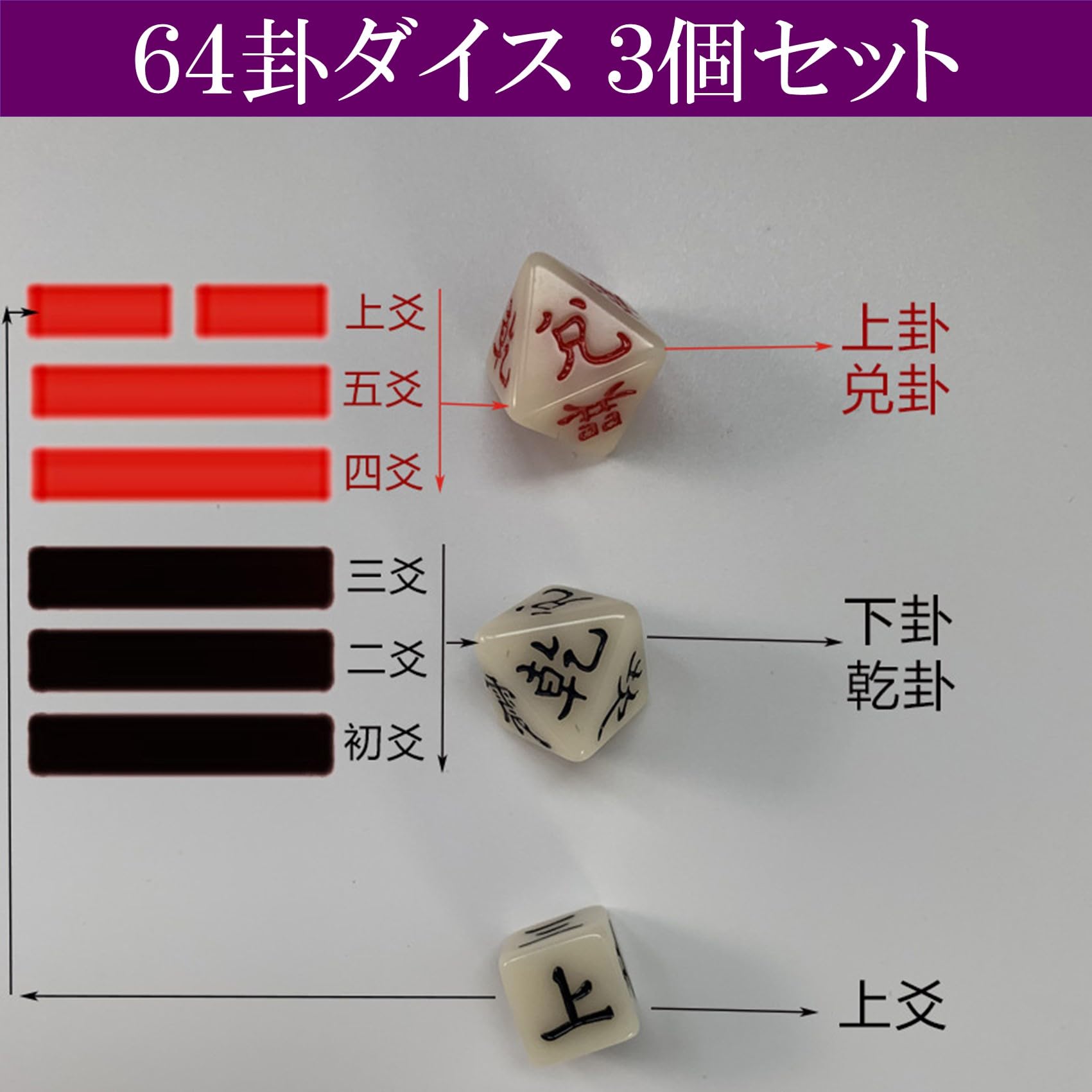 64卦ダイス。易占い、陰陽五行を占う周易八面体ダイスは紅色、黒色それぞれに八卦「乾・兌・離・震・巽・坎・艮・坤」が刻印されています。動爻用六面体ダイスは「上・五・四・三・二・初」が刻印されています。