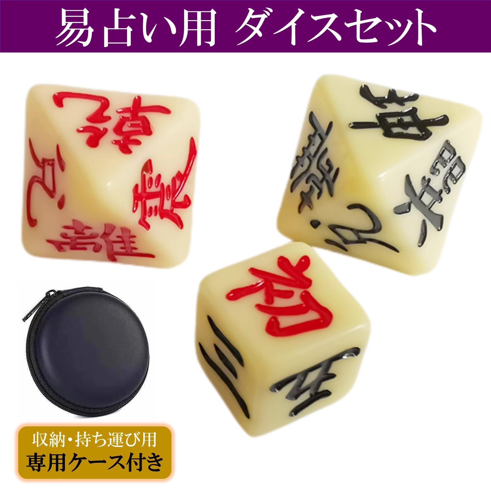 易占い、陰陽五行用 周易八面体ダイス2個(上卦用紅色・下卦用黒色)、六面体ダイス1個(動爻用)合計3個のダイスセットでございます。持ち運びや保管に適した専用のケースを付属しております。