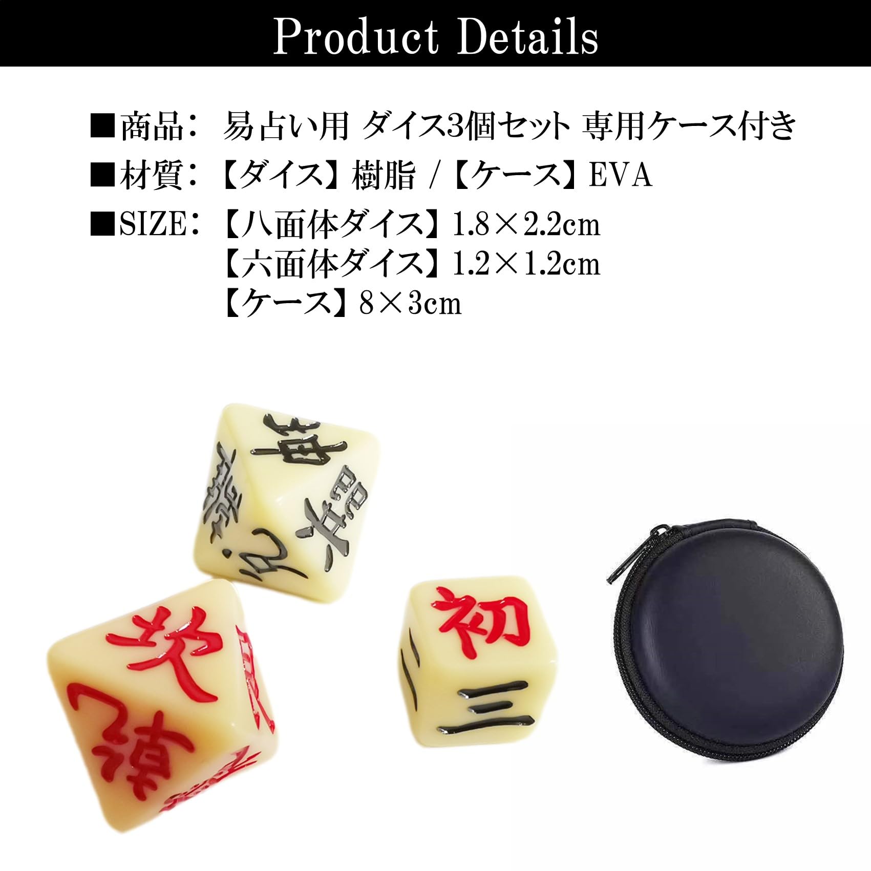 商品詳細:易占い ダイス3個セット 専用ケース付き 【材質】 ダイス: 樹脂 / ケース: EVA 【サイズ】 八面体ダイス: 1.8×2.2cm / 六面体ダイス: 1.2×1.2cm / ケース: 8×3cm