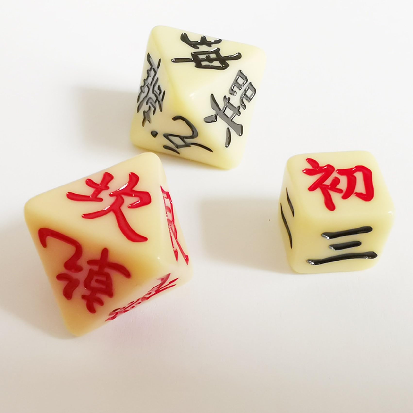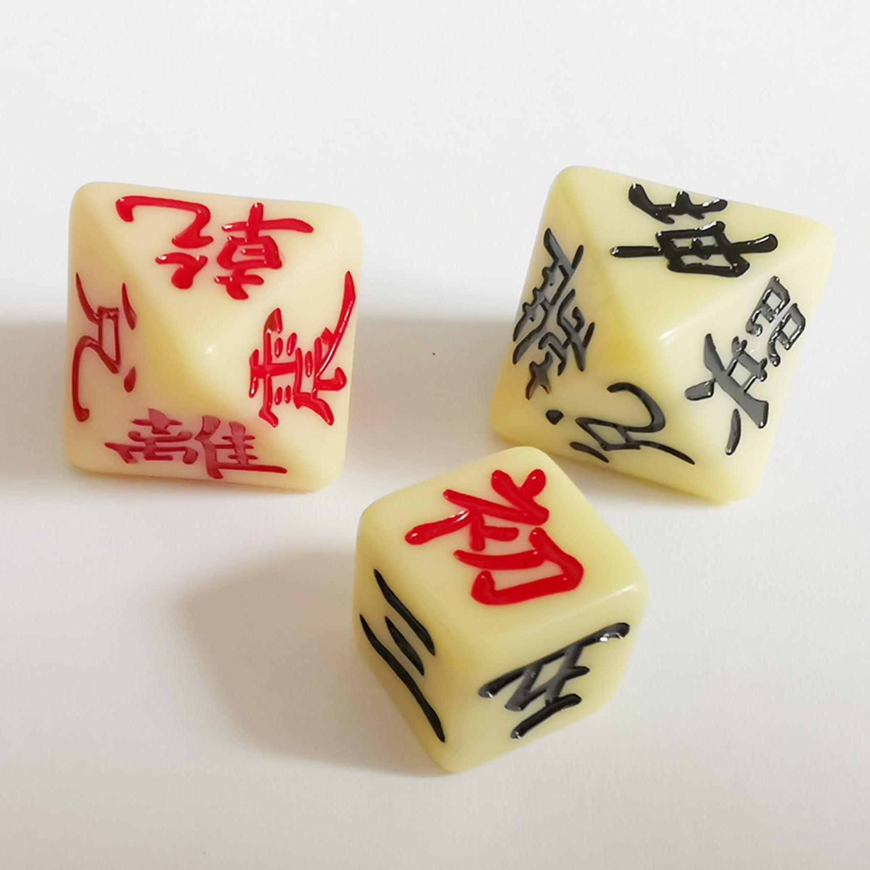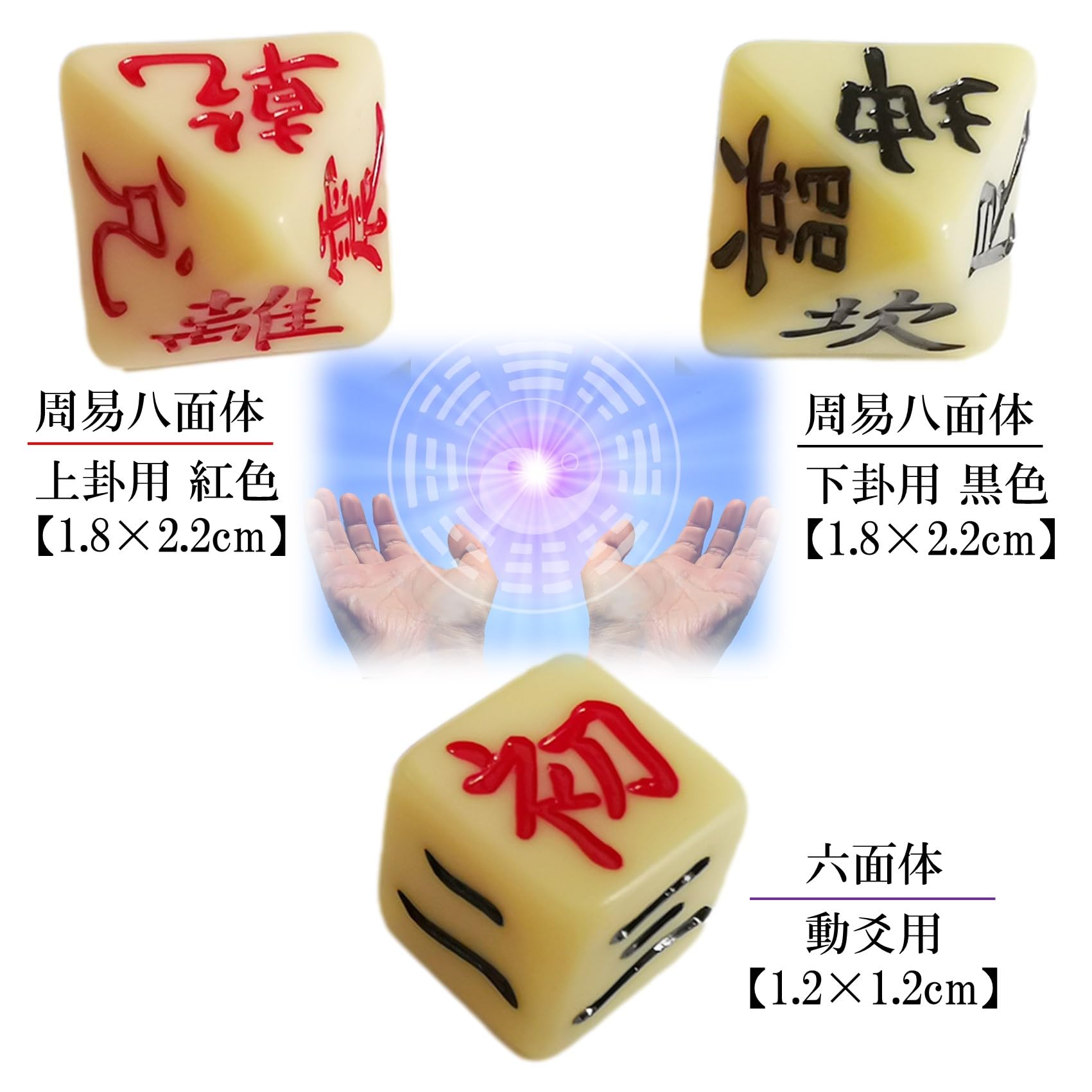 【上卦用】 周易八面体 紅色 1.8×2.2㎝ 【下卦用】 周易八面体 黒色 1.8×2.2㎝ 【動爻用】 六面体 1.2×1.2㎝
