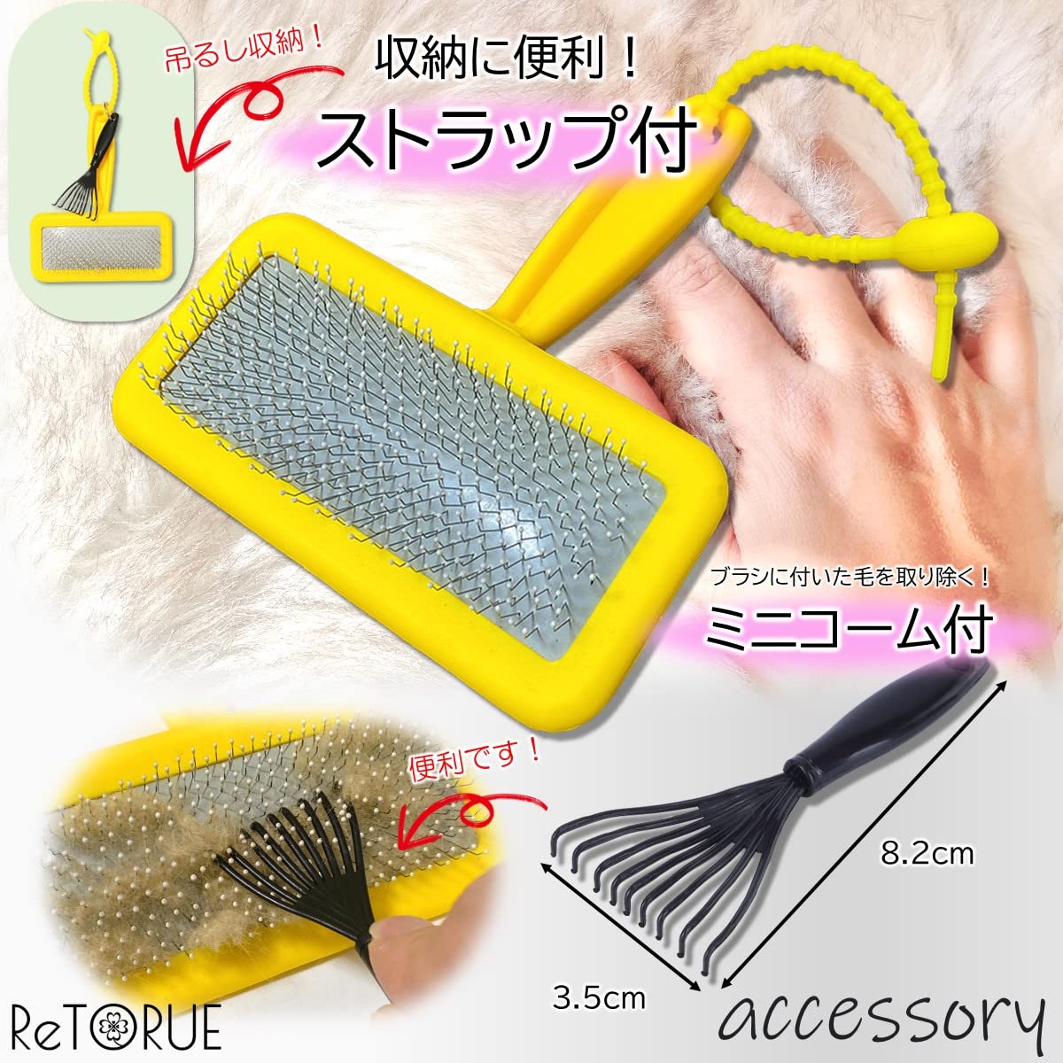 【機能③】引っかけ収納ができる「ストラップ」、絡んだ毛を取り除くための「ミニコーム」の便利な付属品付!