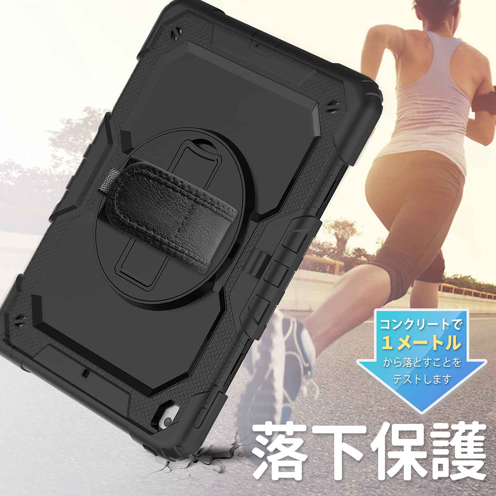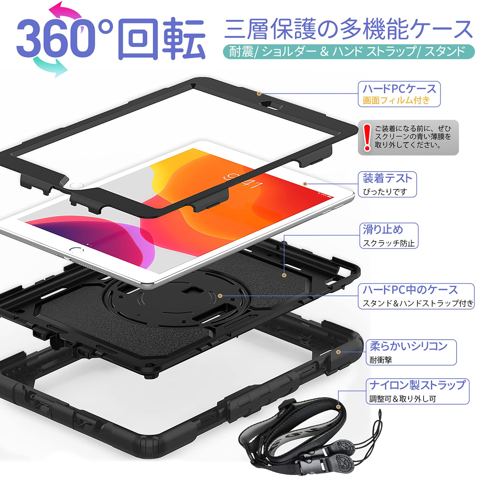 「ハンド&ショルダーストラップ」:バックカバーの回転盤には、手を差し込むとお手持ちのタブレットの重心をしっかり支えるハンドストラップが備わっています。また、最長49インチの調整可能なショルダーストラップが付属しており、仕事/ 学校/ 現場/ 工事/ 旅行など幅広い場合が非常に便利になります。
